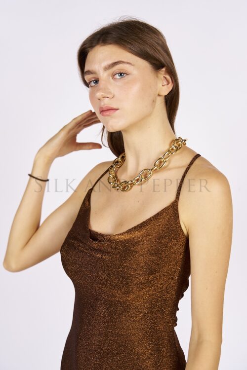 Luminoso, seducente e perfettamente elegante. Questo abito lungo bronzo in lurex, Made in Italy, è pensato per chi ama farsi notare con classe. Il tessuto brillante esalta ogni movimento, mentre il taglio fluido accompagna la figura con leggerezza.