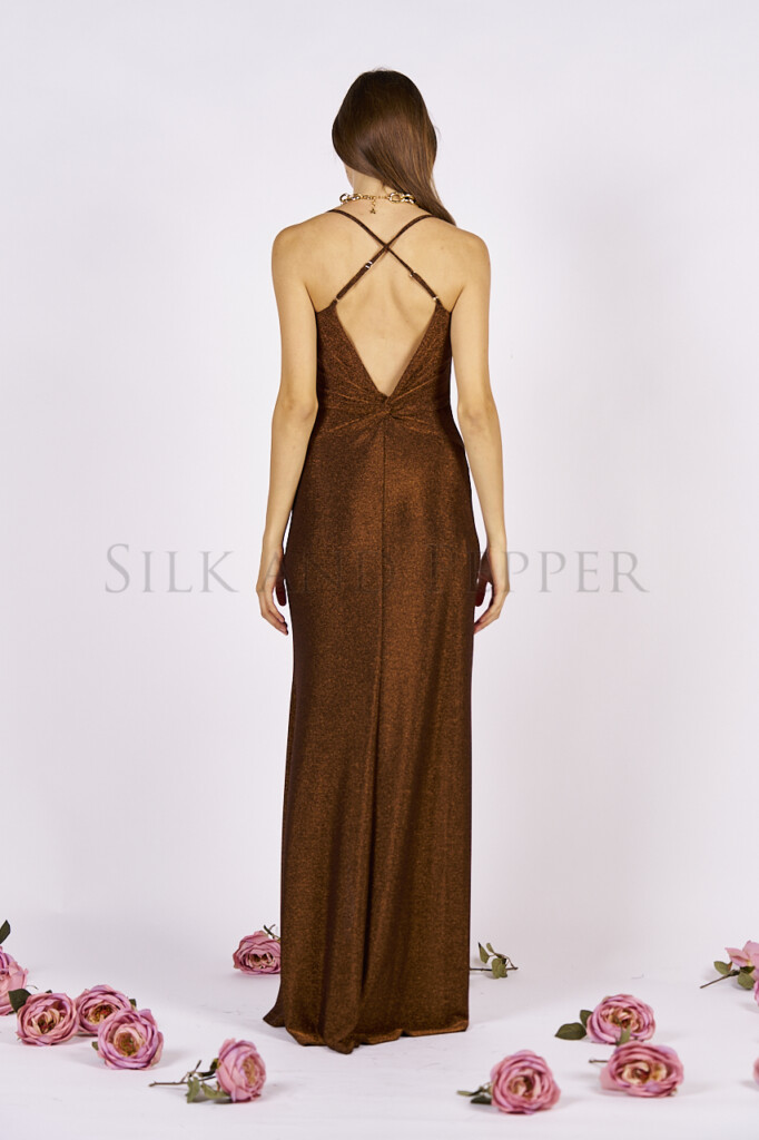 Abito Lungo Bronzo in Lurex con Schiena Incrociata – Made in Italy