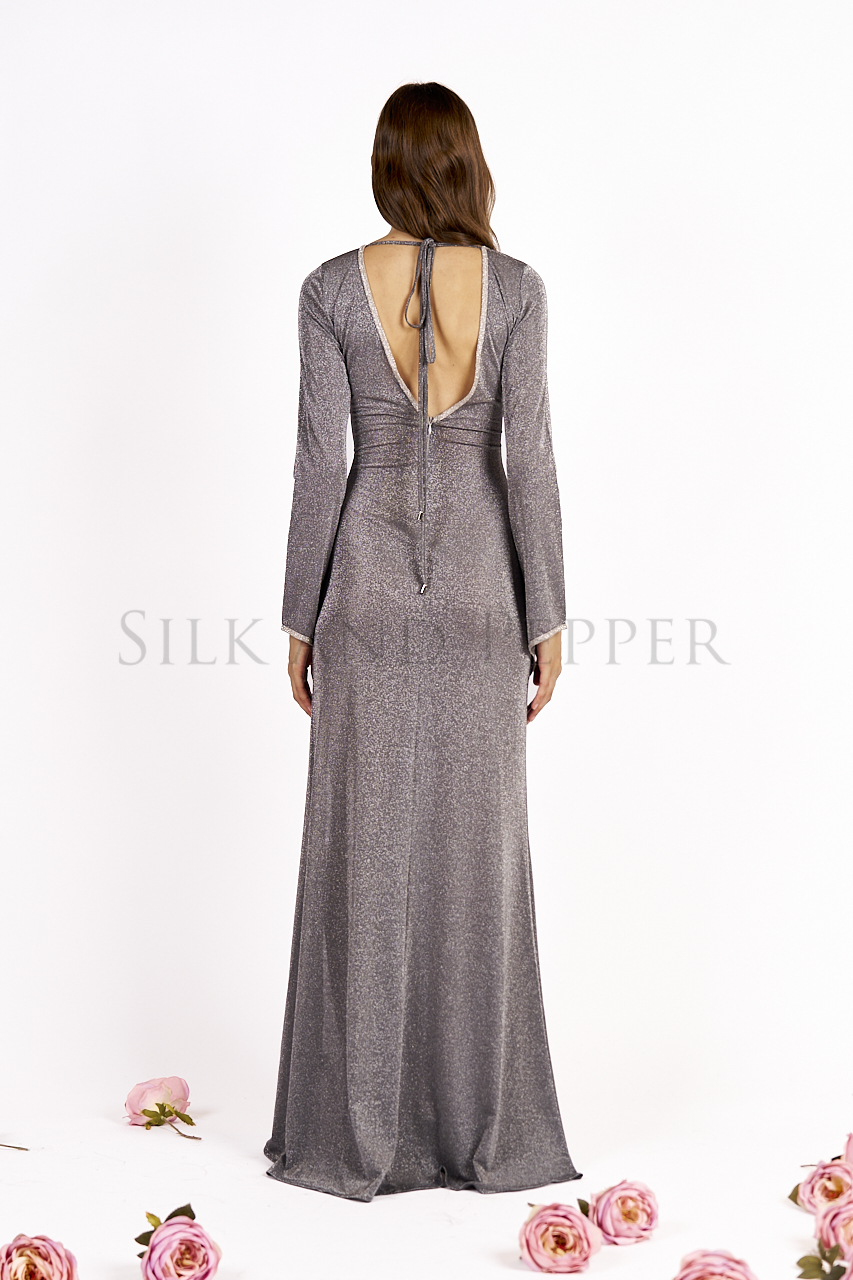Realizzato in un tessuto morbido e leggermente elasticizzato (64% viscosa, 32% lurex, 4% elastane), l’abito avvolge il corpo con una vestibilità femminile e confortevole. Il maxi spacco laterale dona slancio alla silhouette, mentre la scollatura profonda sulla schiena aggiunge un tocco di sensualità sofisticata.