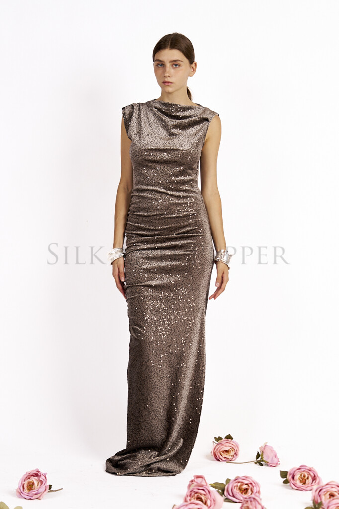 Brilla con eleganza con il nostro abito lungo in velluto grigio con paillettes, un capo che unisce fascino, sensualità e raffinatezza.