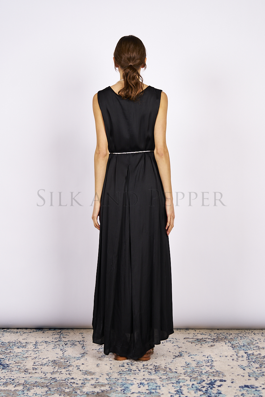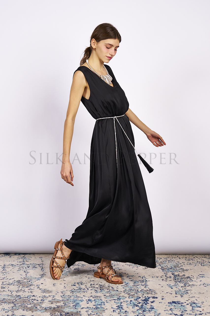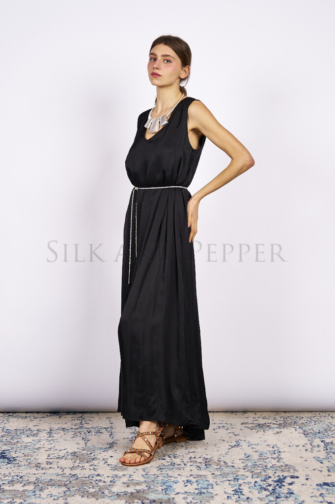 Abito lungo in viscosa nero 100%, smanicato con scollo a V e modello morbido. Elegante, leggero e perfetto per ogni occasione estiva.