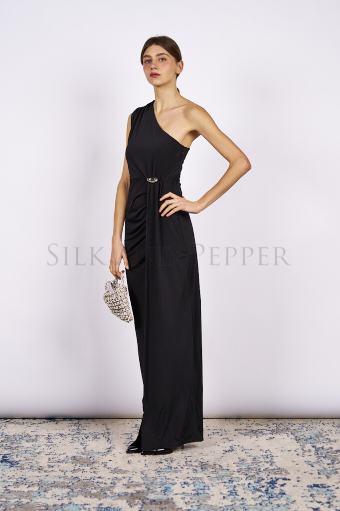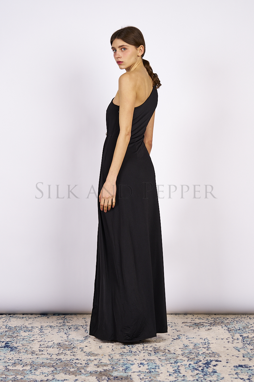 Abito lungo nero monospalla con spacco laterale, zip laterale e spilla gioiello argento.