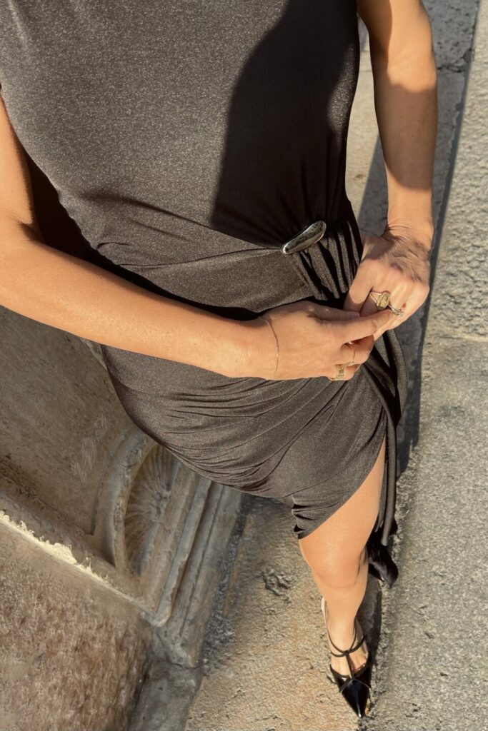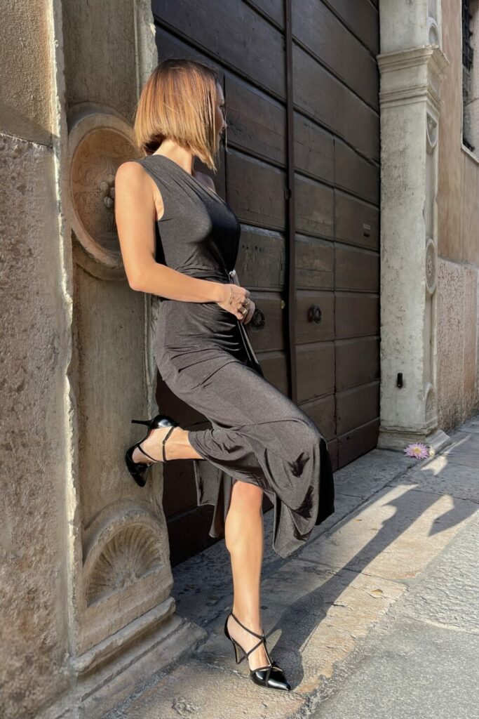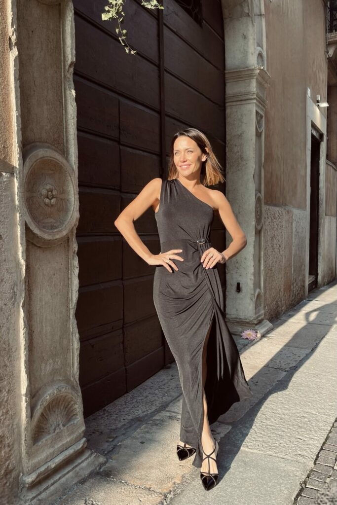 L’abito lungo nero che cattura ogni sguardo e valorizza la silhouette con eleganza e femminilità.