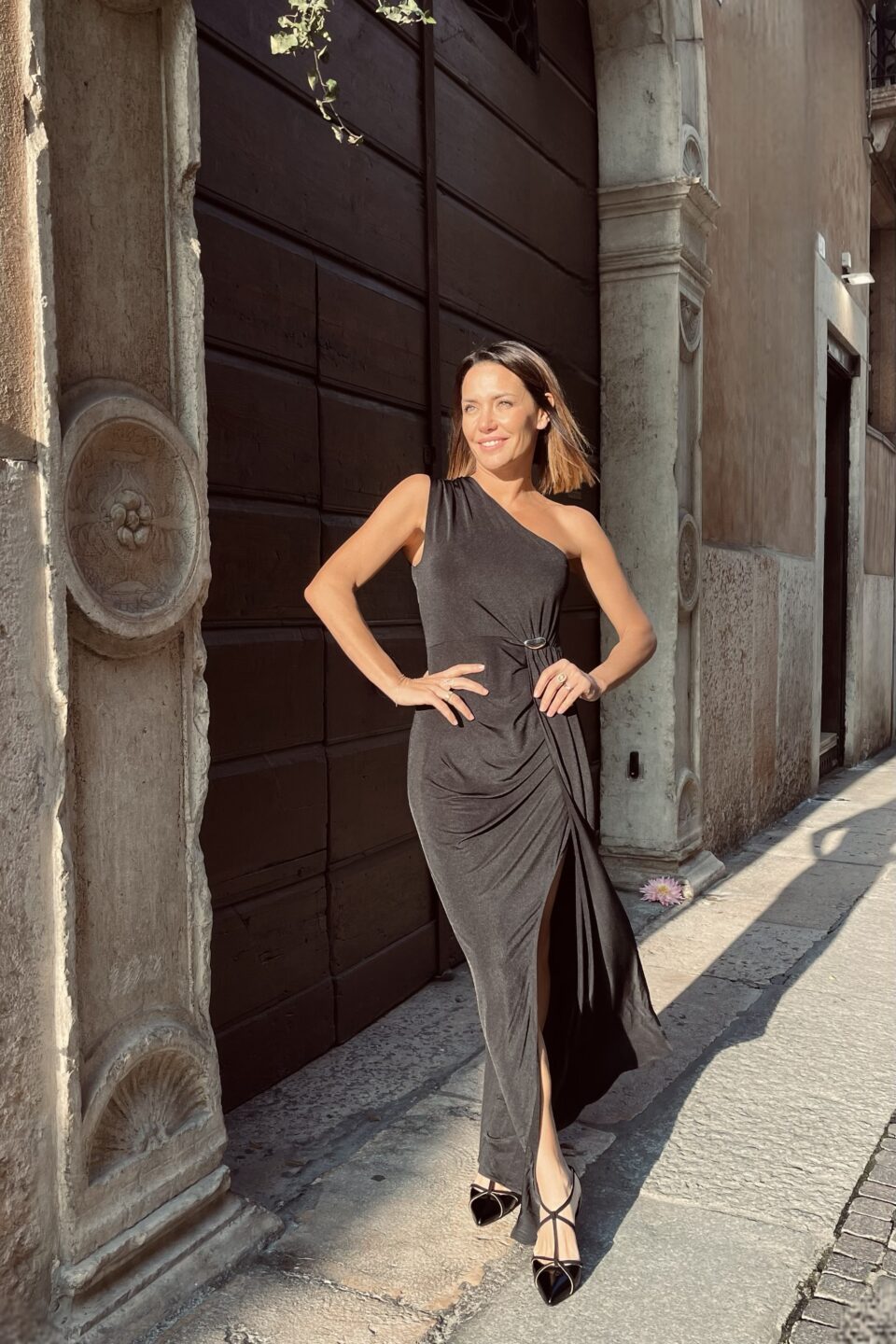 Abito monospalla nero elegante con spacco e spilla gioiello