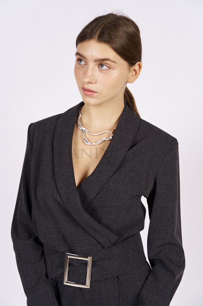 Eleganza senza tempo in un design versatile e contemporaneo. Questo abito corto tipo robe manteau portafoglio in un raffinato grigio antracite è caratterizzato da una linea avvolgente che valorizza la silhouette, chiusa da una cintura che definisce il punto vita con stile.