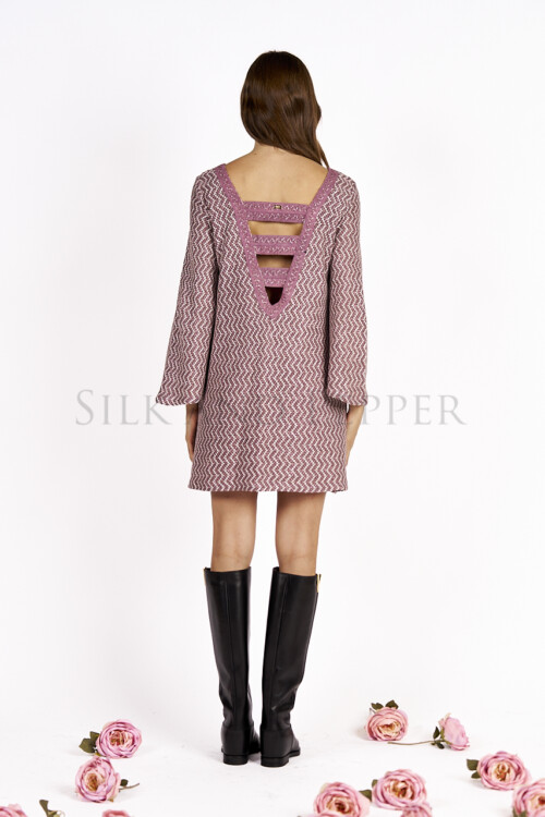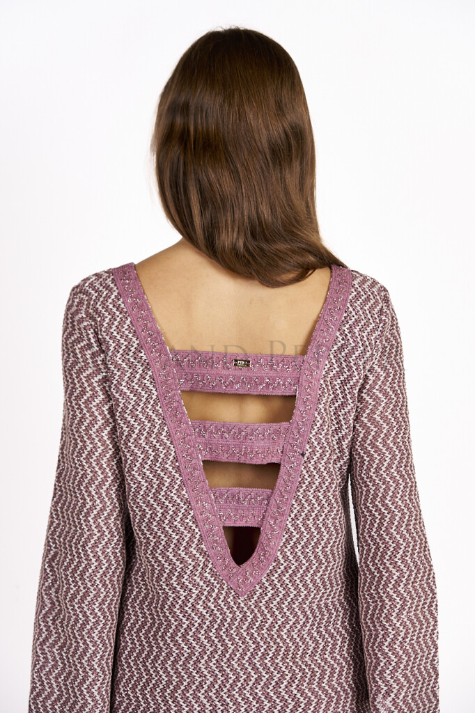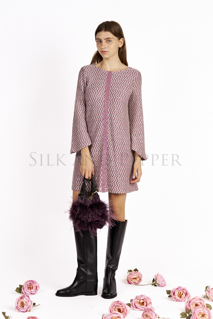 Elegante e raffinato, questo abito a manica lunga a campana si distingue per il suo design femminile e i dettagli ricercati. Realizzato in un delicato tessuto rosa con filati lurex rosa e silver, dona luminosità e movimento ad ogni passo.