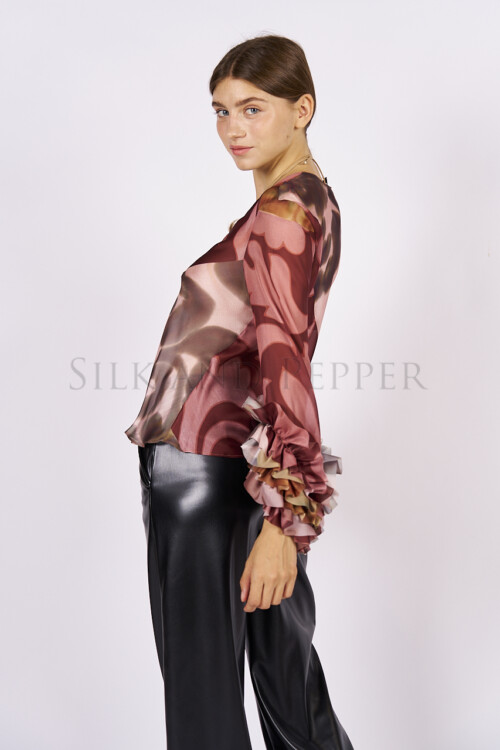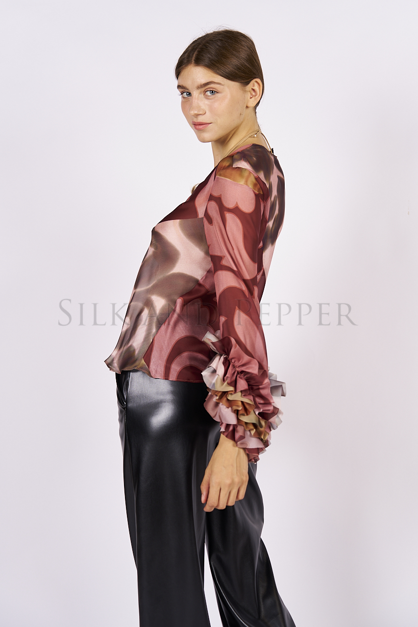 Lo scollo a V morbido slancia la figura con naturalezza, mentre la manica lunga ampia è arricchita da rouches generose e voluminose che donano movimento e un tocco originale, ma sempre raffinato.