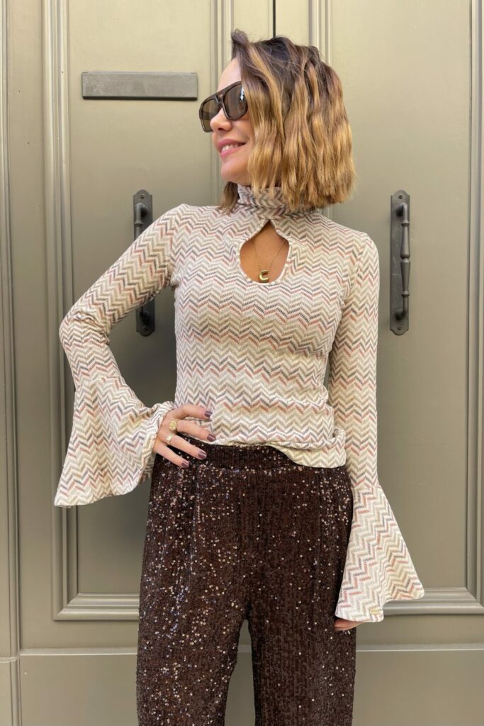 Realizzata con una composizione di alta qualità (40% cotone, 40% poliestere, 14% viscosa, 4% fibra metallizzata, 2% poliammide), la Blusa Rachel Orange Flame combina comfort, morbidezza e un delicato effetto luminoso.