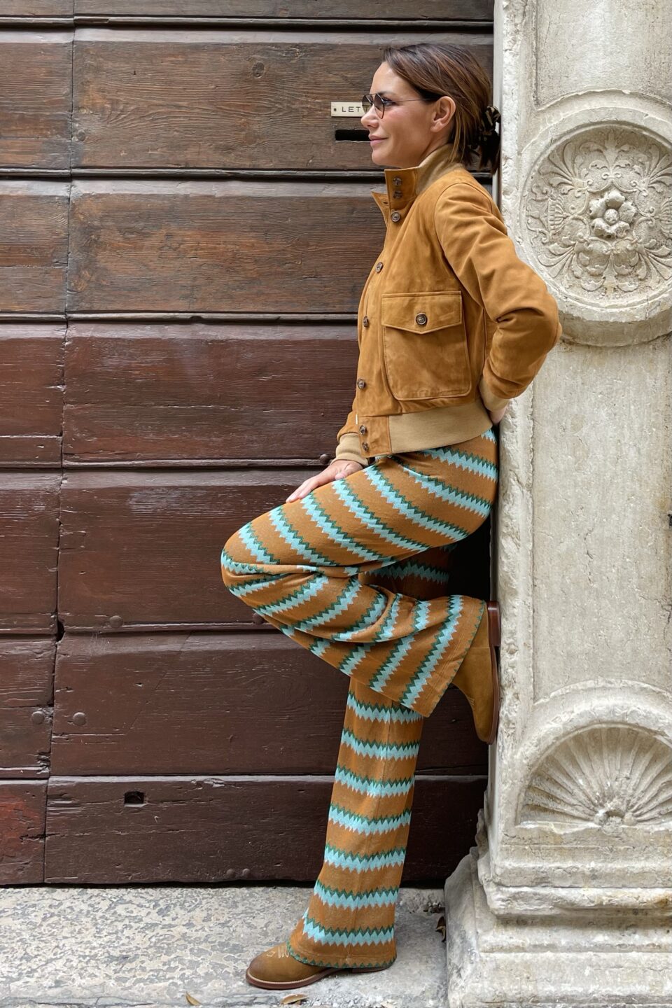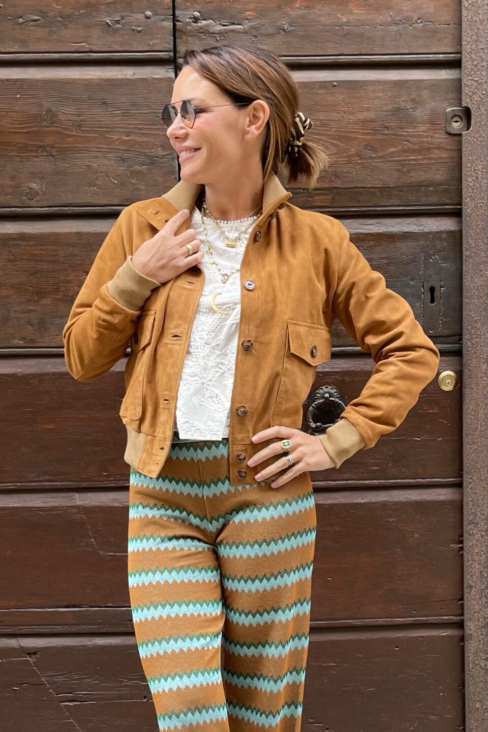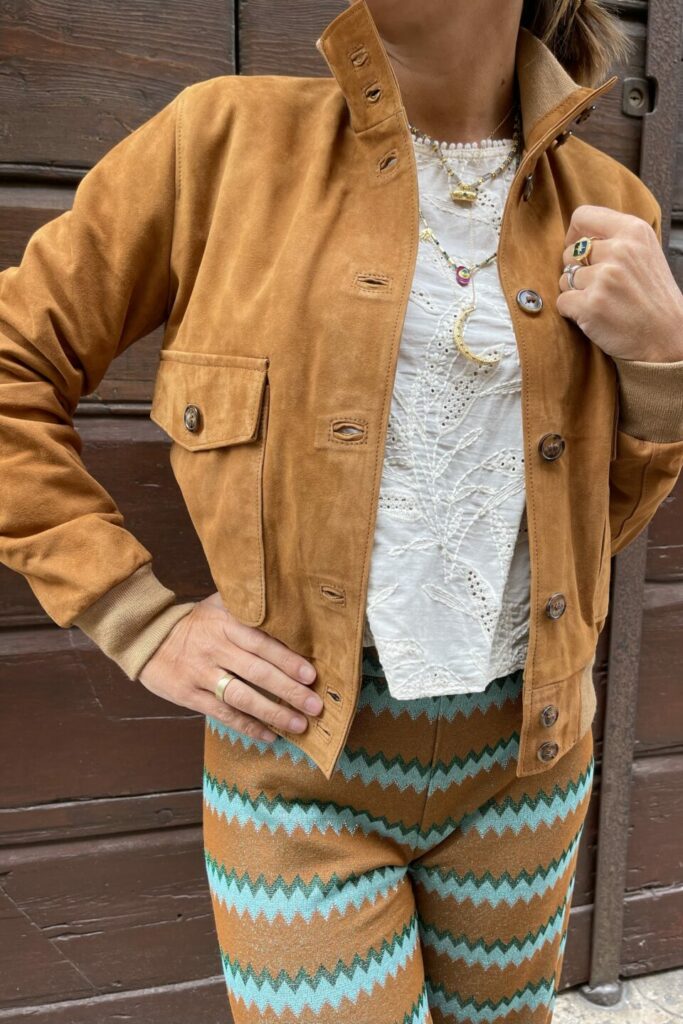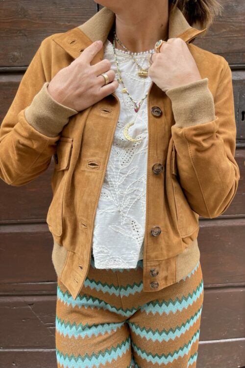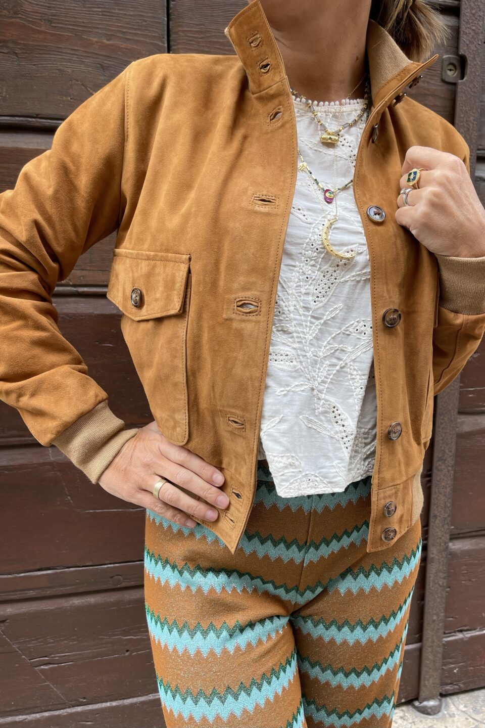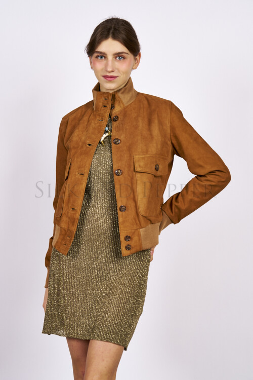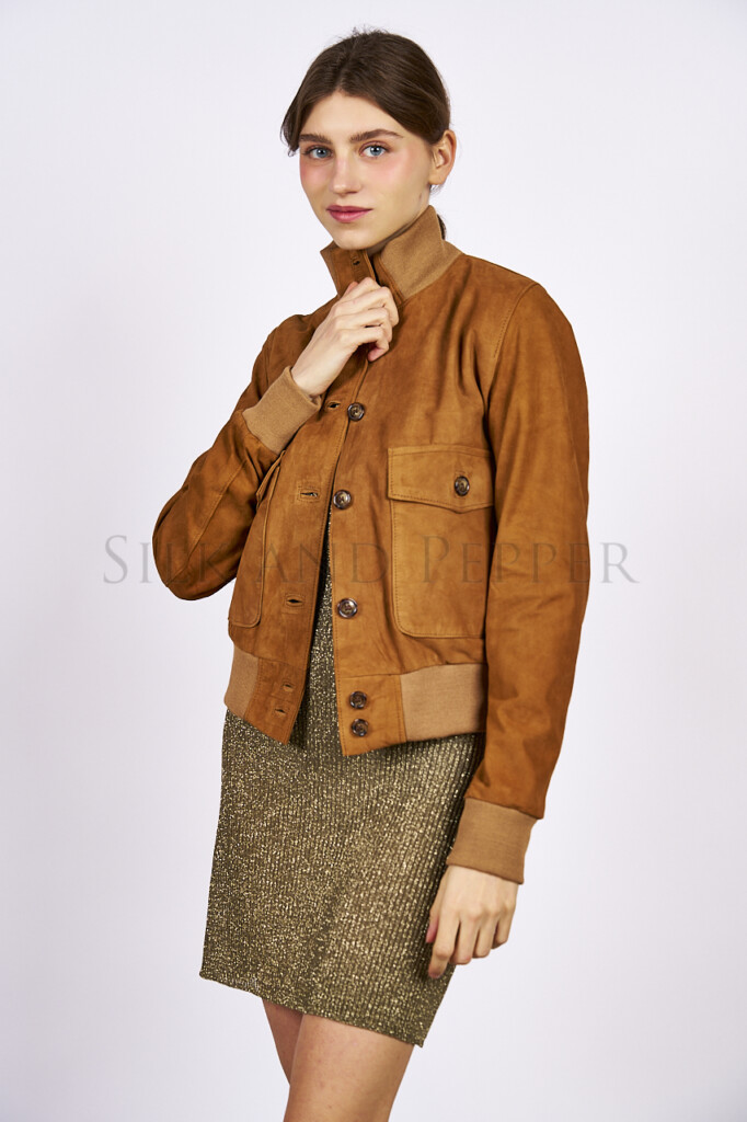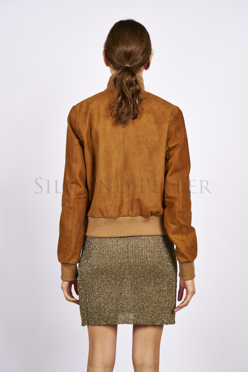 Realizzata in 100% pelle scamosciata, morbida al tatto e ricca di personalità, avvolge il corpo con una vestibilità regolare che segue le linee senza costringere. Il design è pulito e contemporaneo, impreziosito dai dettagli tipici del bomber: collo, polsini e fondo in maglia elasticizzata a costine, che definiscono la silhouette e creano una forma naturalmente armoniosa.