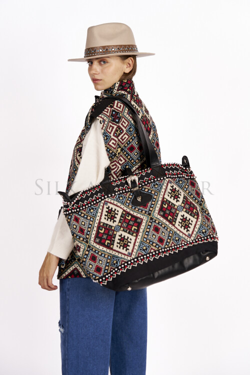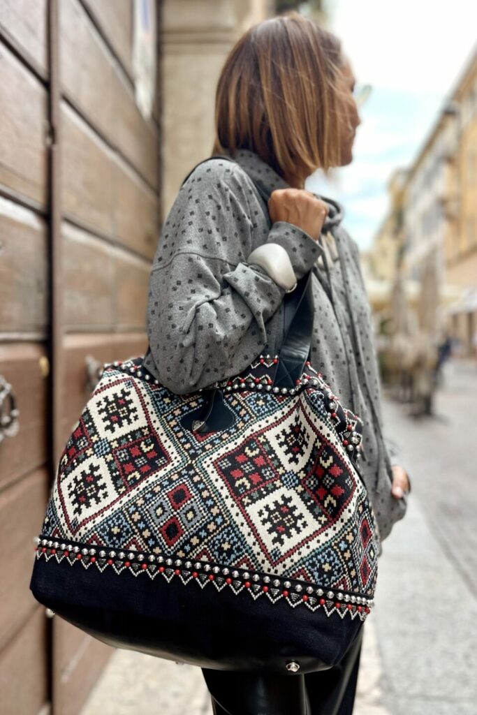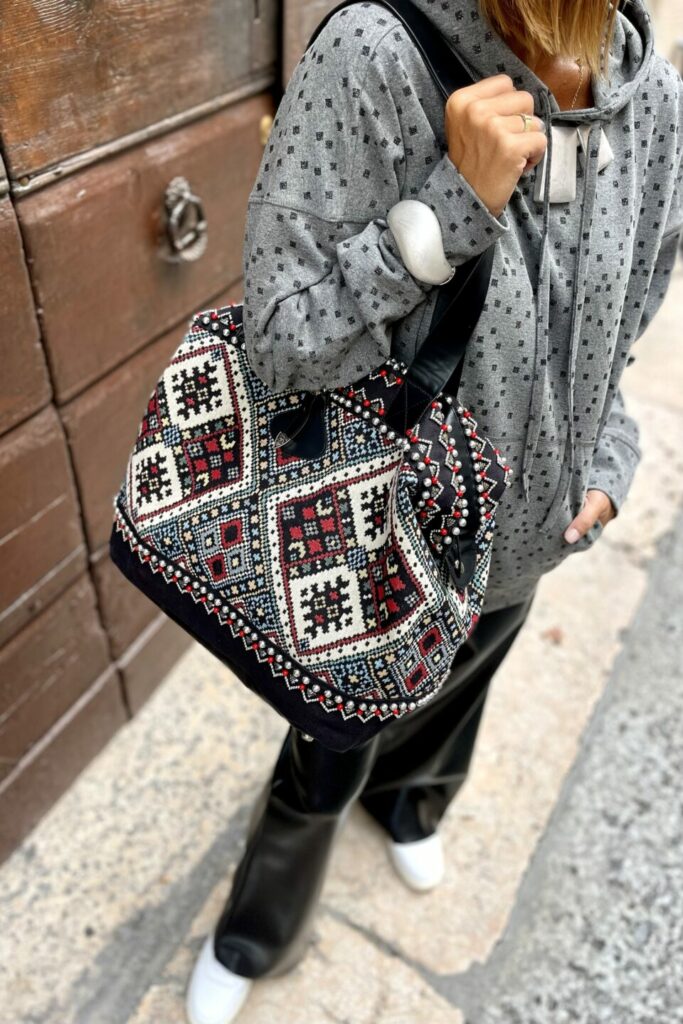 Dai un tocco di stile unico ai tuoi outfit con questa splendida borsa ethnic chic multicolor. Realizzata con dettagli raffinati come borchie decorative e perline rosse, è l’accessorio perfetto per chi ama un look originale e sofisticato.