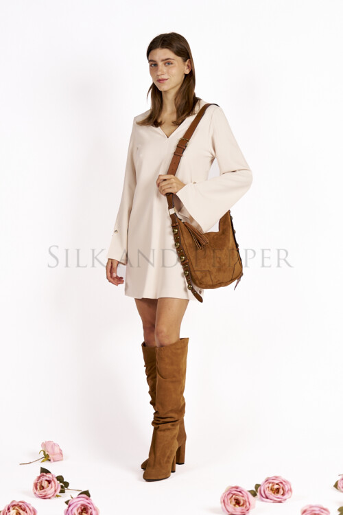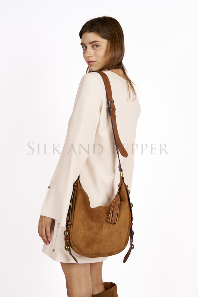 Questa borsa piccola da donna in suede cammello è la scelta giusta per chi cerca un mix di eleganza boho e dettagli contemporanei, facile da abbinare a look casual o più raffinati.