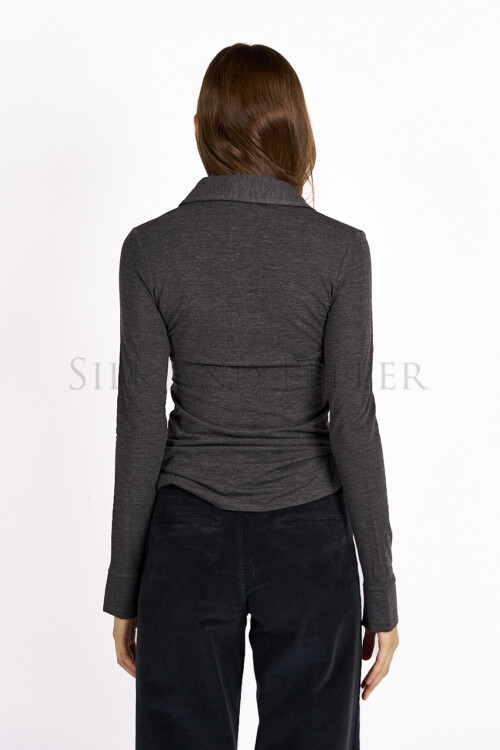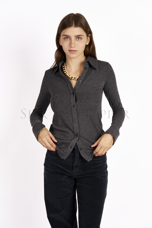 La chiusura frontale a bottoni la rende pratica e chic, mentre il polsino a V aggiunge un dettaglio ricercato che valorizza lo stile femminile. Grazie alla sua linea pulita e al taglio moderno, può essere indossata sia in ufficio che nel tempo libero, abbinandosi facilmente a pantaloni eleganti, gonne o jeans.