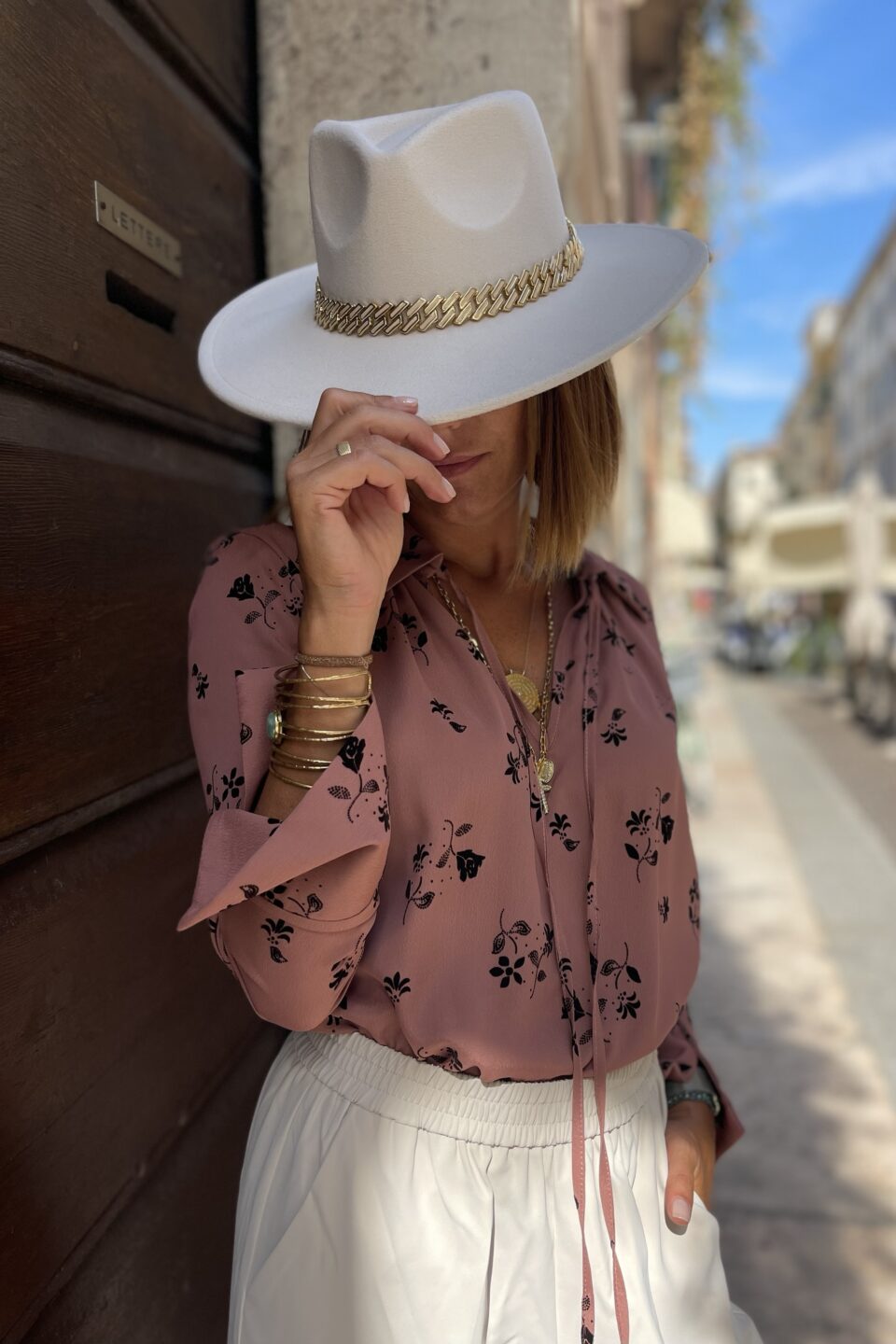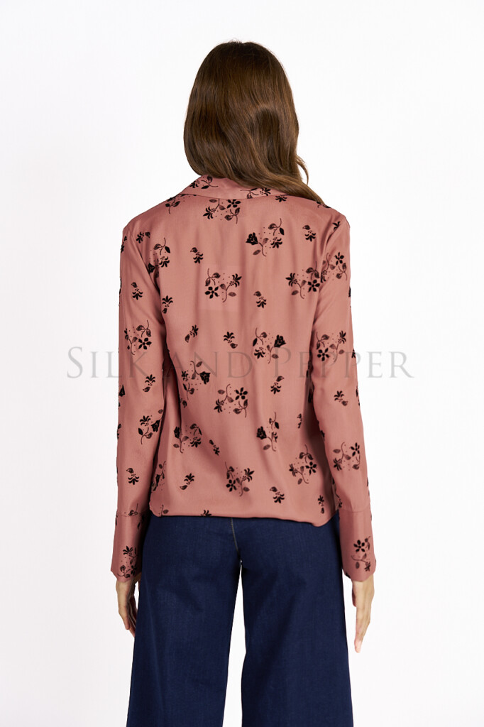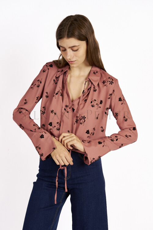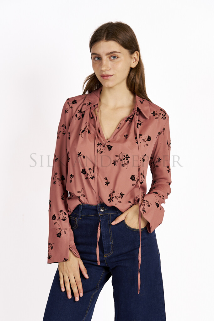 Elegante e femminile, questa camicia donna a manica lunga è perfetta per un look sofisticato ma leggero. Realizzata in 100% viscosa, garantisce un tocco morbido e delicato sulla pelle. Il design presenta uno scollo a V con nastro regolabile e un polsino a V aperto, per un dettaglio raffinato e moderno. La stampa blush con delicati flowers neri aggiunge un tocco romantico e versatile, ideale per outfit da ufficio o per momenti casual chic. Il fondo delicato conferisce un movimento naturale e femminile.