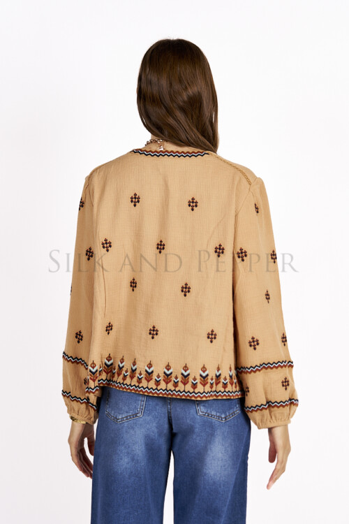 Il colore mocha mousse incontra una raffinata fantasia ricamata in stile indie con dettagli traforati in macramé, rendendo questa camicia un capo unico e di tendenza. Facile da abbinare con jeans, gonne o pantaloni eleganti, è ideale sia per look casual da giorno sia per outfit più ricercati da sera.
