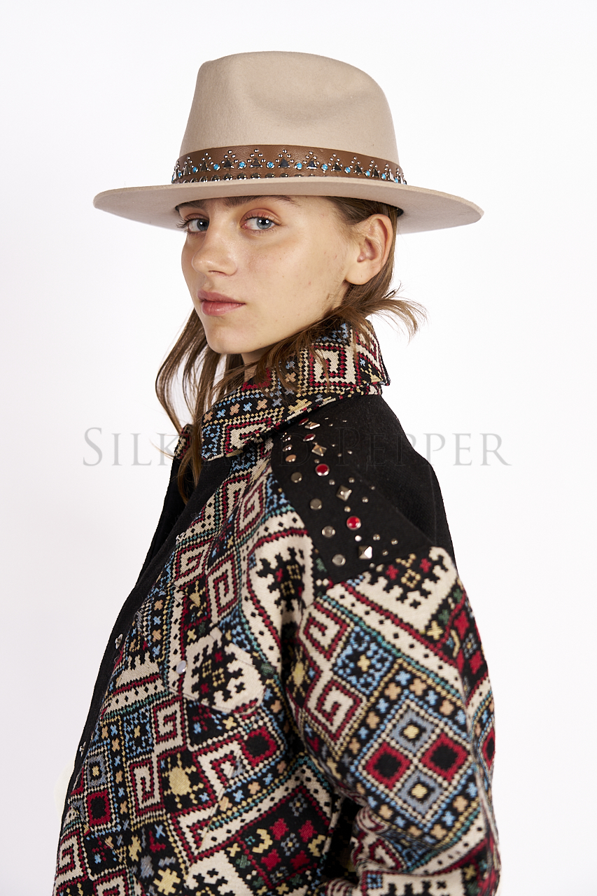 Aggiungi un tocco di eleganza e originalità al tuo look con questo cappello a tesa larga da donna in morbido velluto beige, perfetto per completare outfit casual chic o più raffinati. La decorazione con borchie silver e pietre azzurre dona carattere e luminosità, trasformando un accessorio classico in un dettaglio di stile unico.