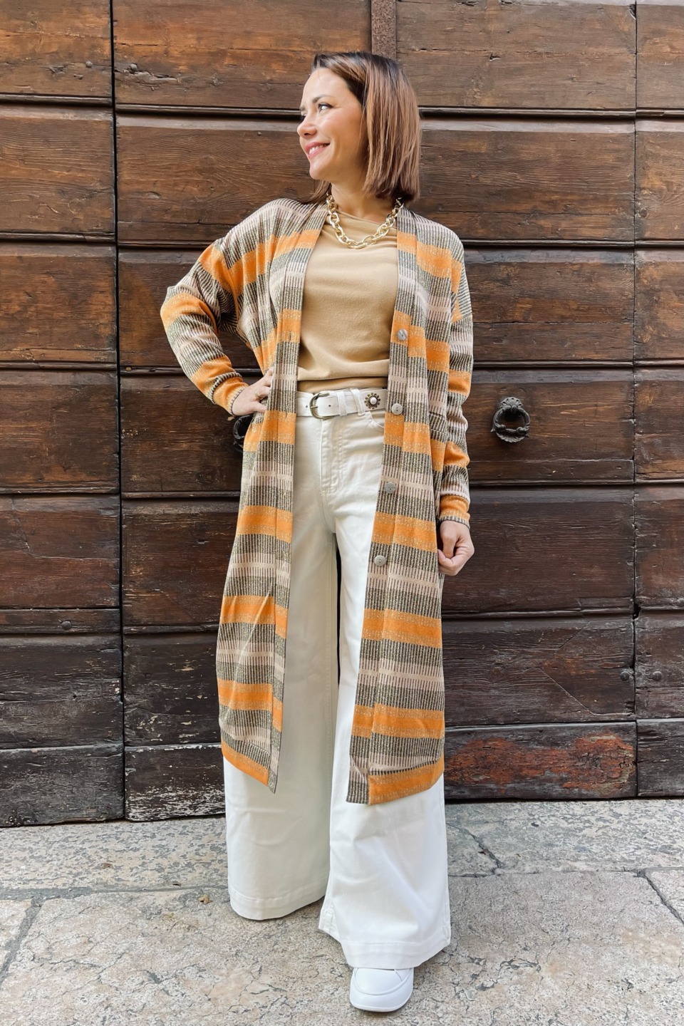 Abito cardigan con scollo a V e maniche lunghe. Chiusura frontale con bottoni.