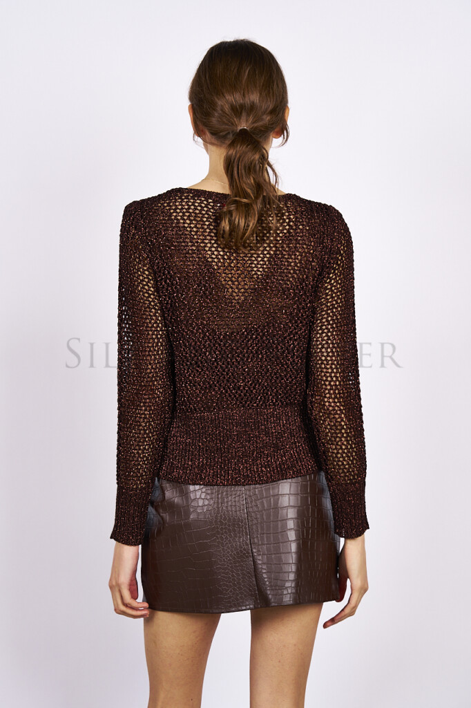 Realizzato con una composizione di 80% viscosa e 20% fibra metallizzata, assicura una sensazione morbida e leggera sulla pelle. La viscosa garantisce traspirabilità e comfort durante tutta la giornata, mentre il filo lurex aggiunge un tocco glamour che rende il capo perfetto sia per look quotidiani che per occasioni più ricercate. La lavorazione traforata dona movimento e leggerezza al design, rendendolo ideale per le mezze stagioni o come strato elegante da sovrapporre a top, camicie e abiti.