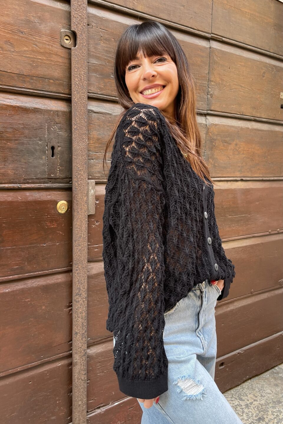 La maglia traforata crea un delicato gioco di vedo-non-vedo, mentre lo scollo a V slancia la figura e valorizza il décolleté con naturale eleganza. I bottoni coordinati aggiungono un tocco pulito e sofisticato, perfetto sia chiuso come top che aperto sopra una canotta o un abito.
