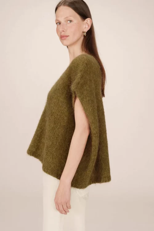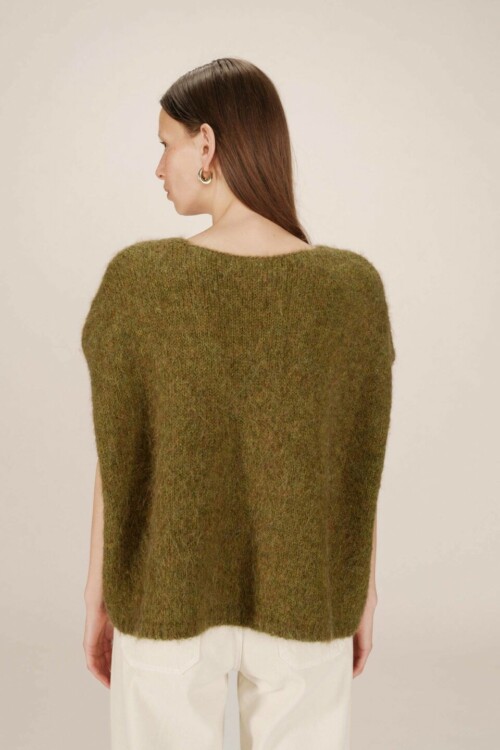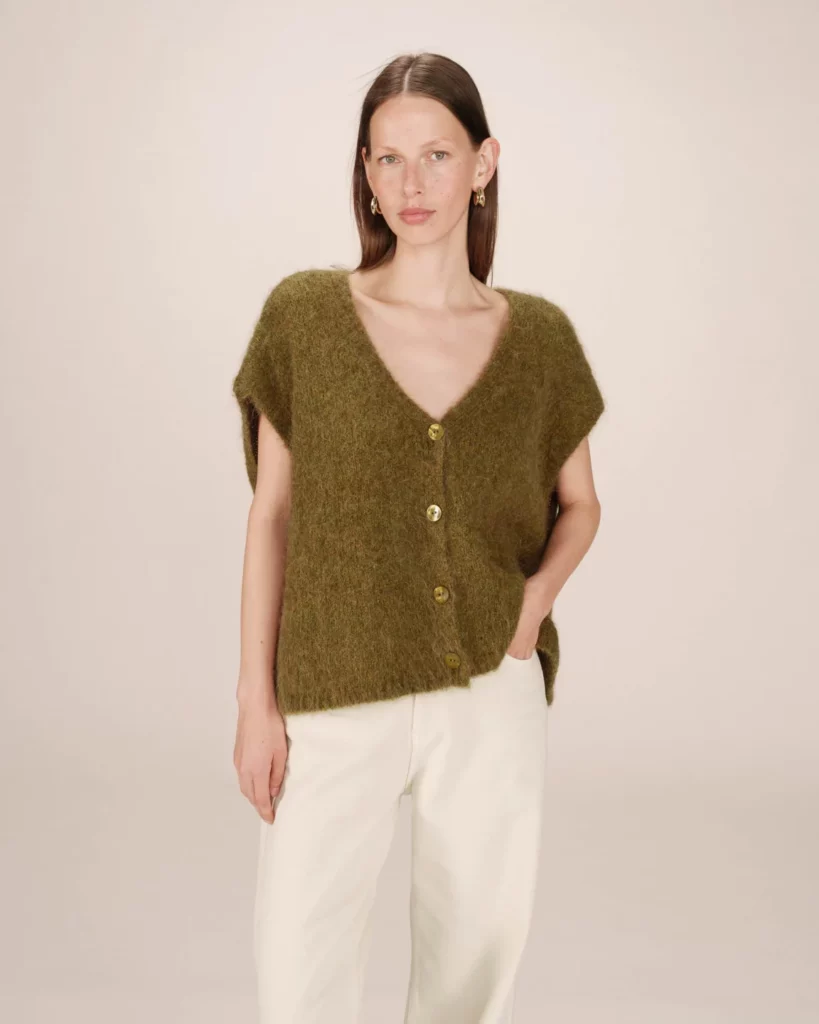 Il cardigan donna senza maniche color oliva è un capo raffinato e versatile, perfetto per completare con stile ogni outfit. Realizzato in un pregiato filato misto alpaca, lana e viscosa, offre morbidezza, calore e comfort.