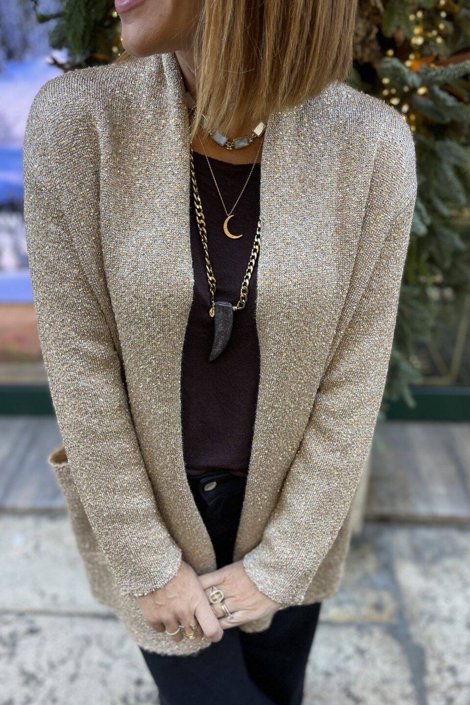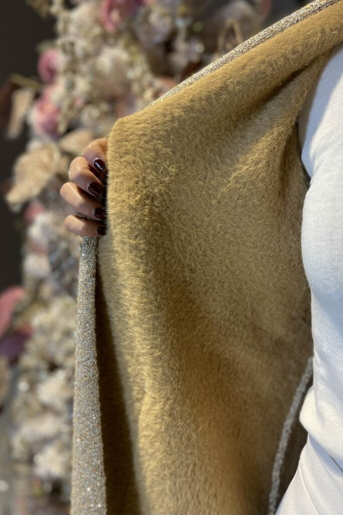 Brilla con il cardigan strass miele: aperto, con tasche e interno effetto fluffy. Morbido, elegante e perfetto per ogni look.