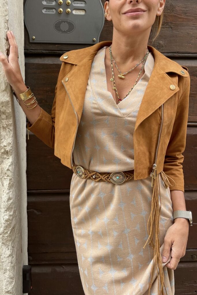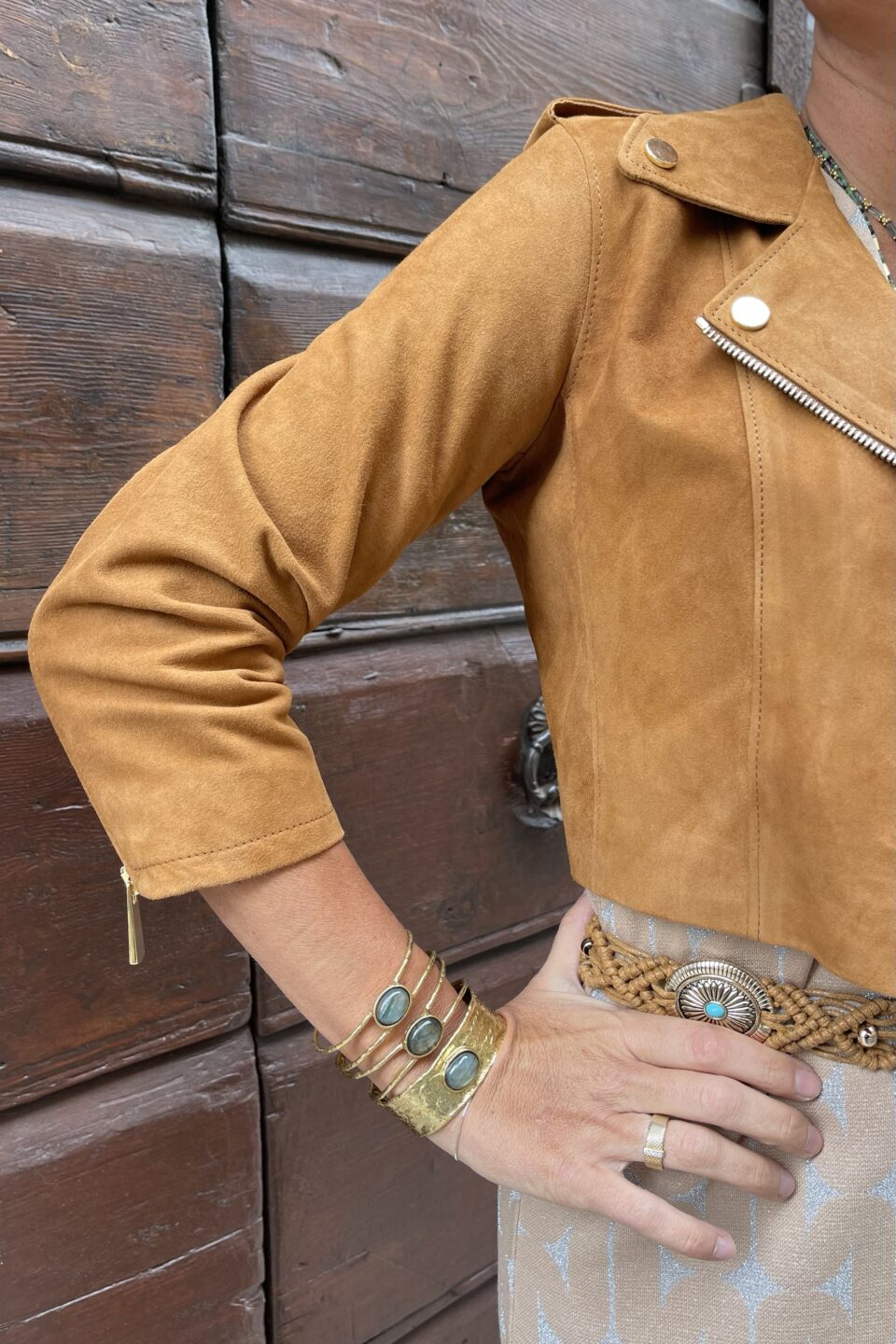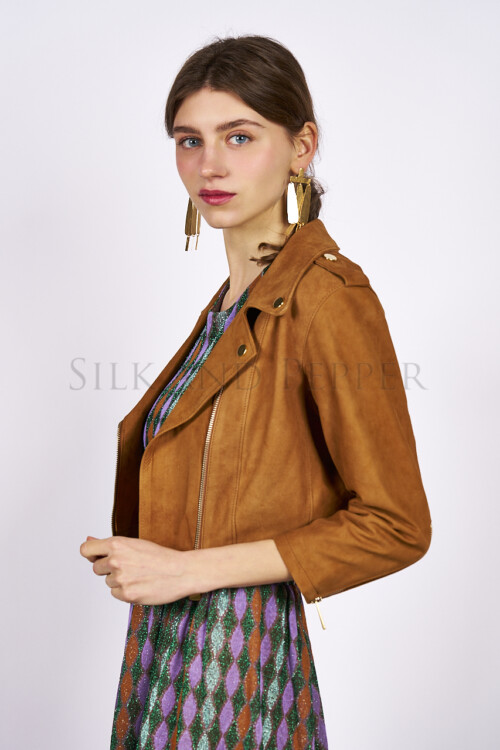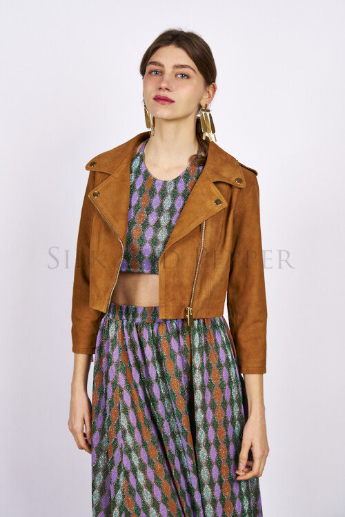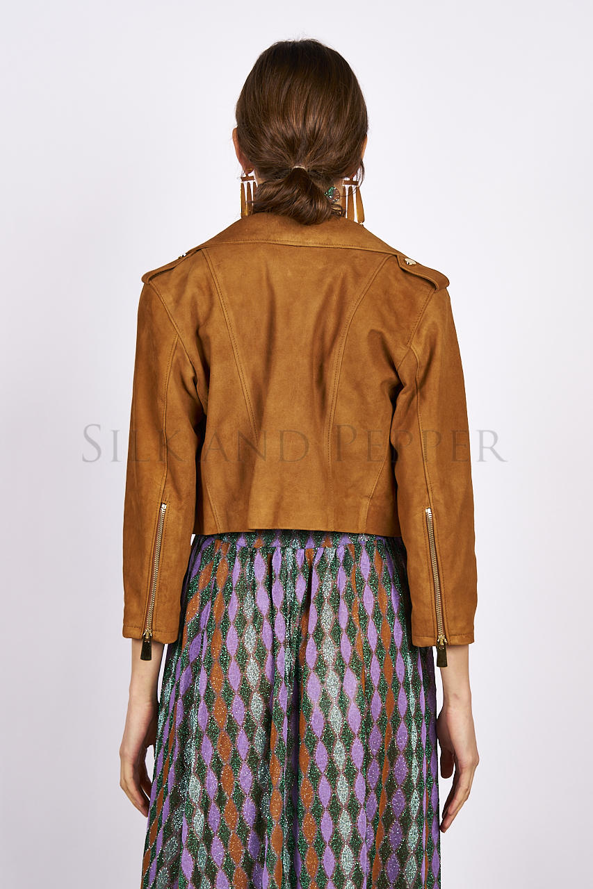 Questo chiodino crop in camoscio marrone è la nostra interpretazione più femminile e sofisticata dello spirito biker: audace, sensuale, divertente da indossare.