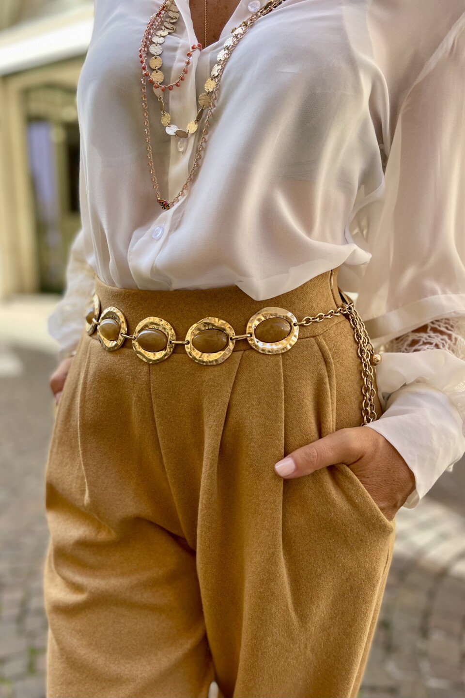 Realizzata interamente in metallo dorato, questa cintura gioiello da donna è impreziosita da pietre senape incastonate all’interno delle medaglie decorative, creando un raffinato gioco di luci e riflessi.