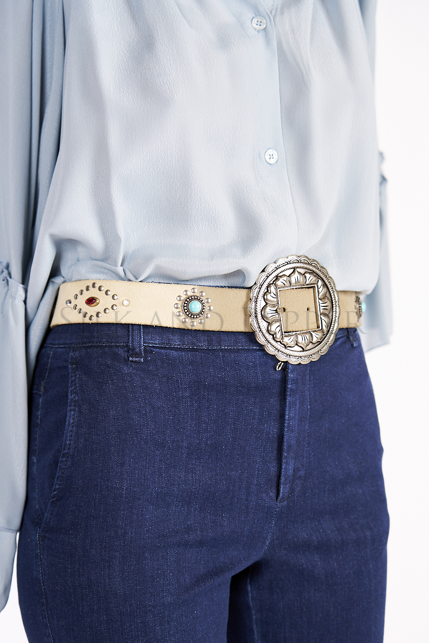 Cintura artigianale in vera pelle Made in Italy color latte di cocco con pietre turchesi e fibbia silver rotonda