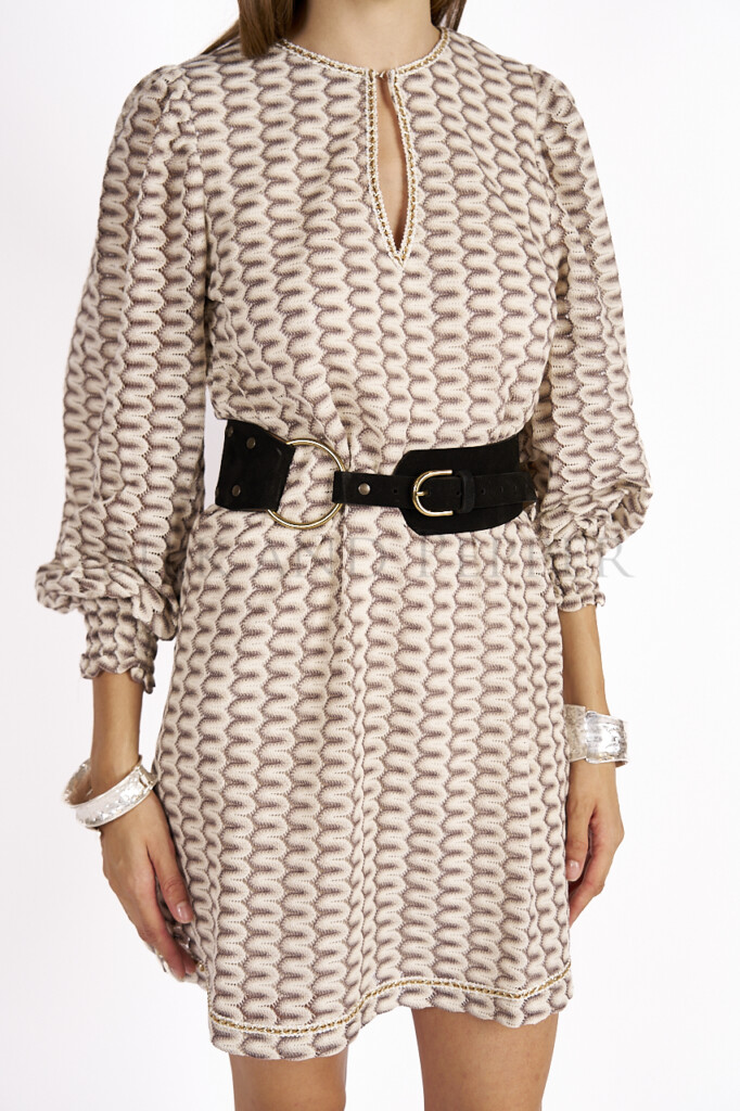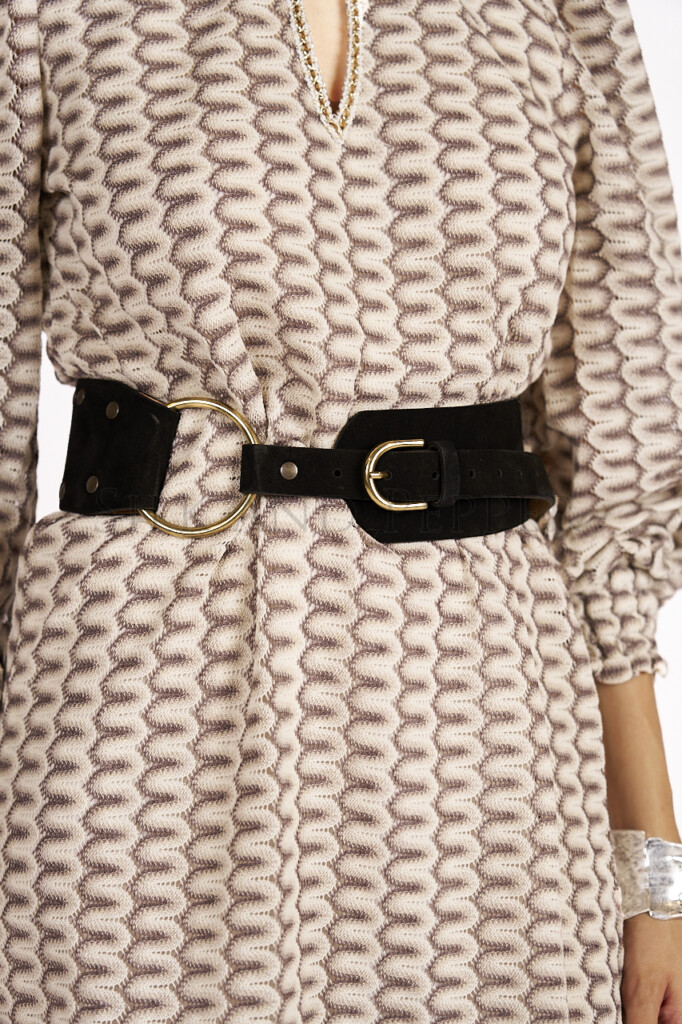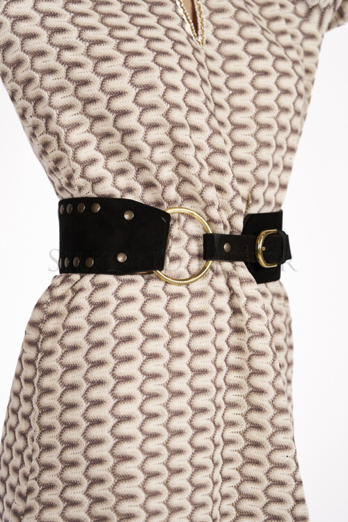 Perfetta da indossare sopra abiti, camicie oversize o cappotti, questa cintura esalta il punto vita con eleganza, valorizzando ogni look casual o chic. La finitura in camoscio nero dona un tocco caldo e sofisticato, mentre le borchie decorative rendono l’accessorio grintoso e glamour.