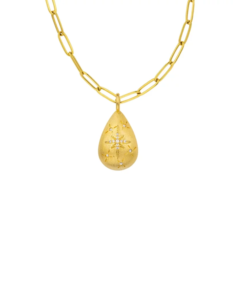 Realizzata con placcatura in oro 24 carati ottenuta da oro riciclato, questa collana rappresenta l’incontro tra design contemporaneo e attenzione alla sostenibilità. Il pendente drop, dalle forme morbide e armoniose, è disegnato a mano, un dettaglio che rende ogni collana unica e speciale.