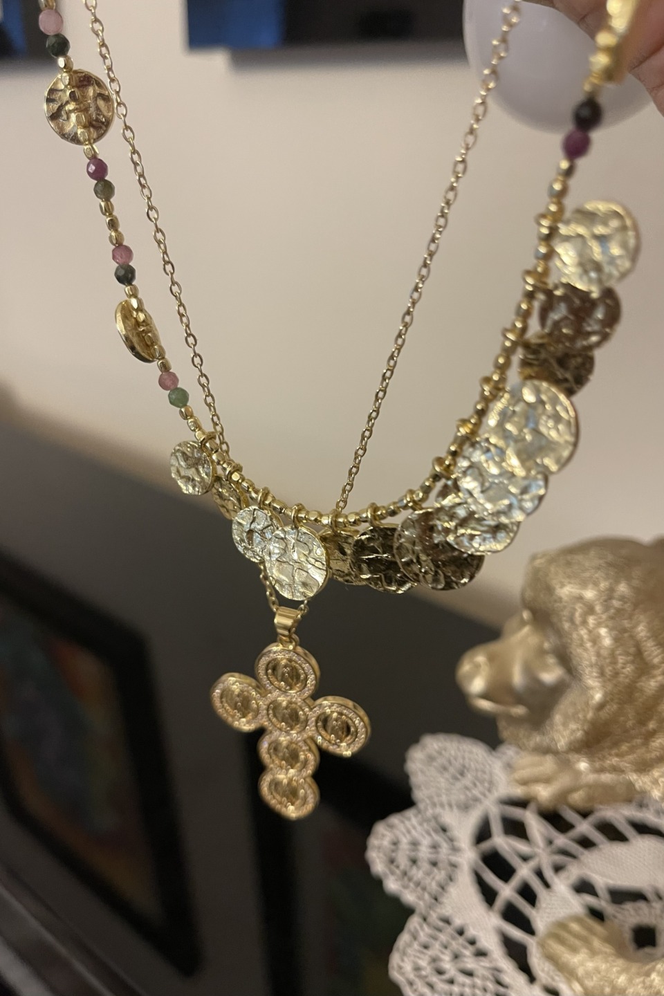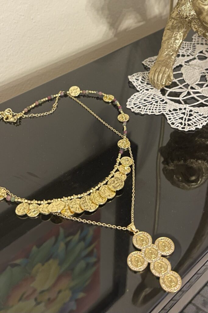 Una collana delicata ma piena di carattere, dove piccole tormaline naturali multicolor catturano la luce e creano giochi di riflessi luminosi e sfumature preziose sul décolleté. La struttura in oro dona calore alla pelle e un’eleganza senza tempo, leggera e confortevole da indossare tutto il giorno.