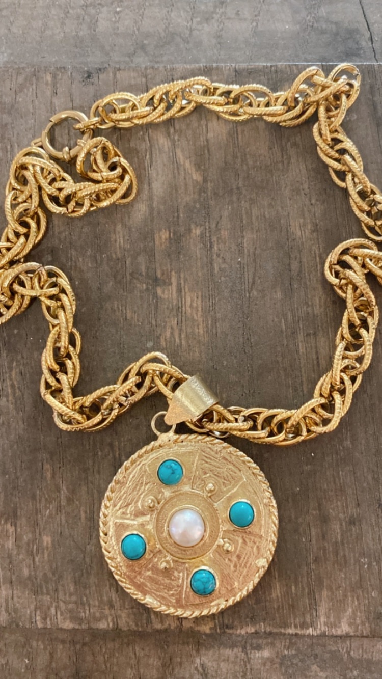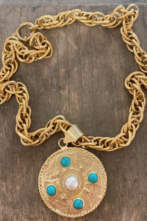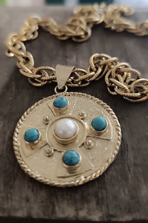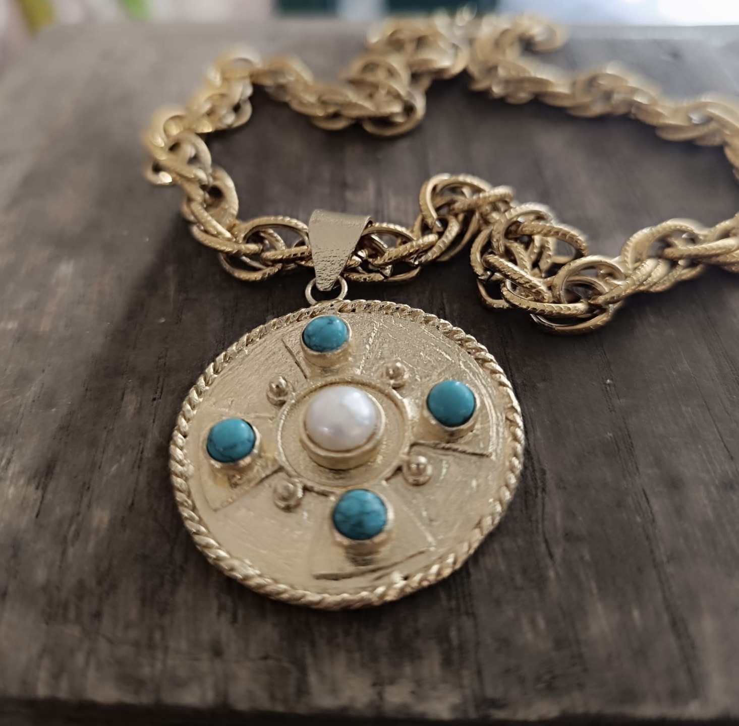 collier medaglione in ottone galvanizzato con perla e perline verdi