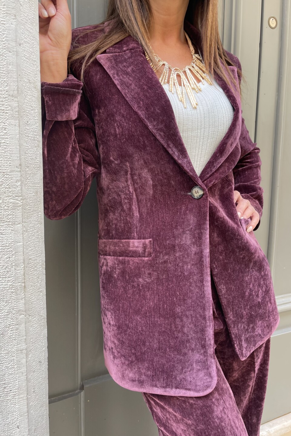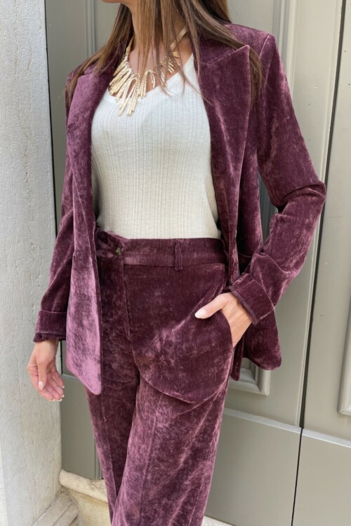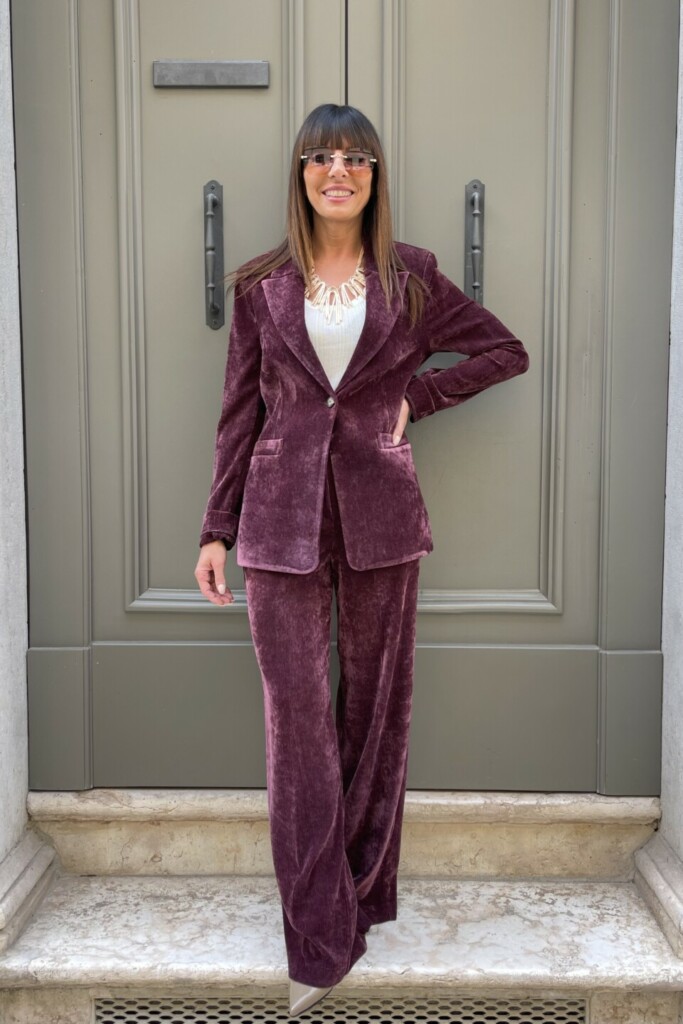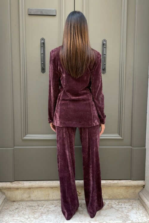Completo bordeaux in velluto donna – giacca monopetto e pantalone palazzo