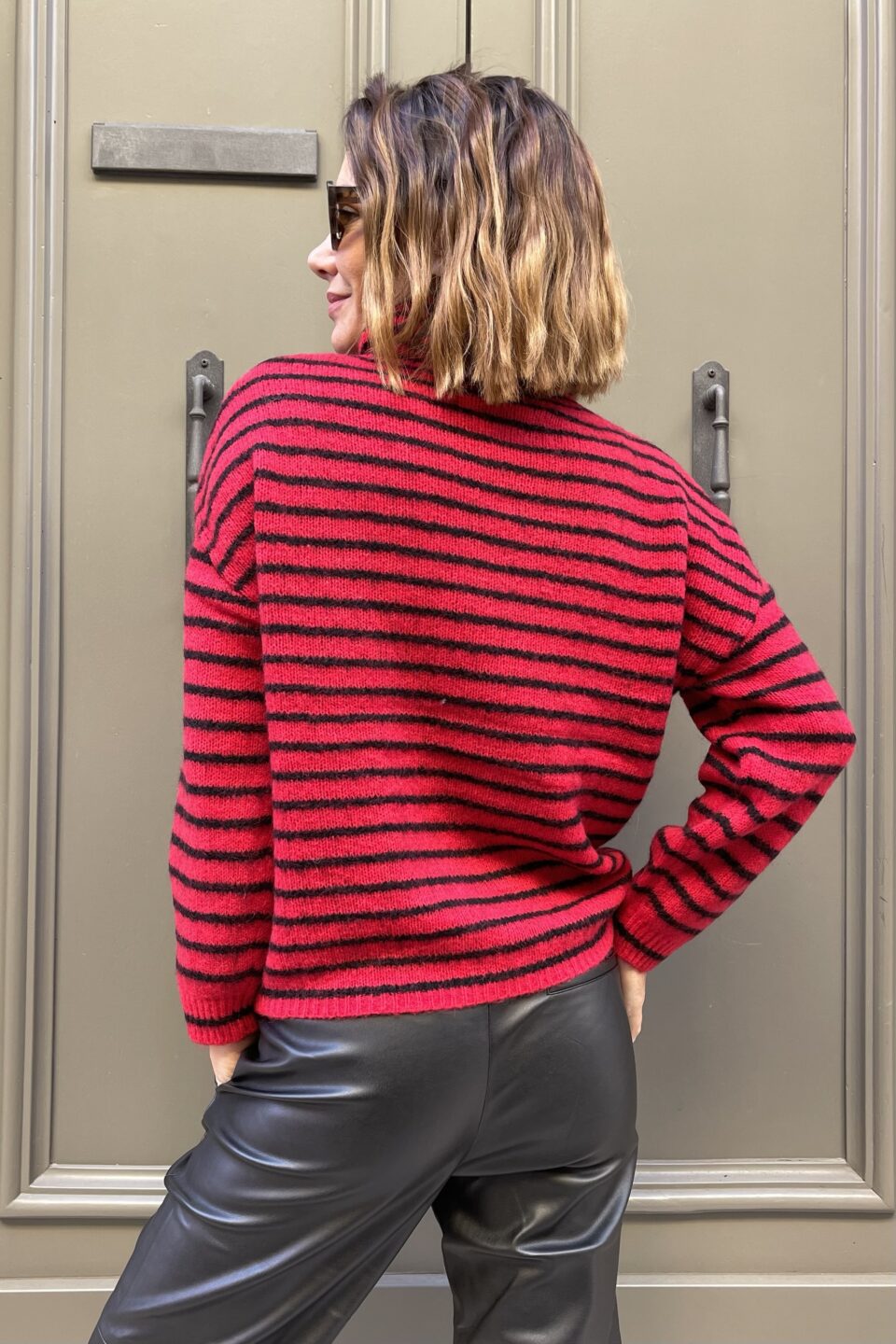 Il design a righe nere su base rossa dona un look deciso e contemporaneo, perfetto sia per outfit casual con jeans, sia per abbinamenti più eleganti con pantaloni sartoriali o gonne midi. Il collo alto avvolge con calore, rendendo questo dolcevita una scelta raffinata e versatile per le giornate più fredde.