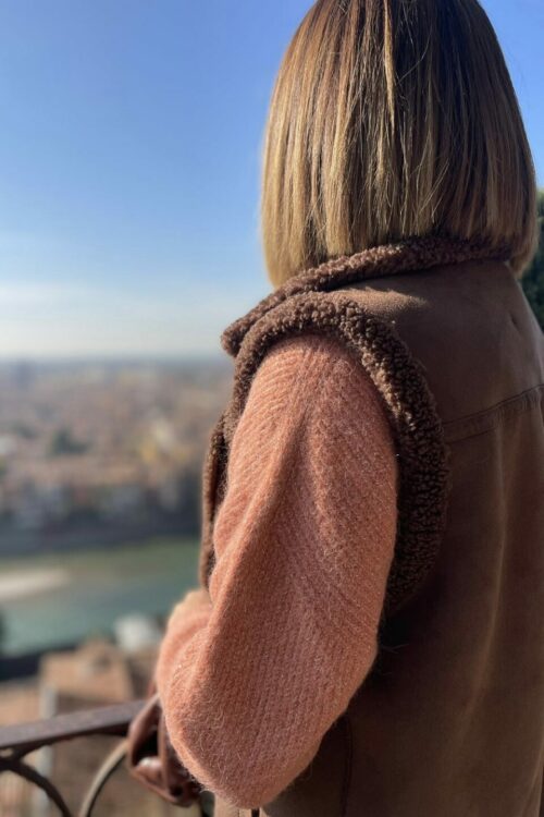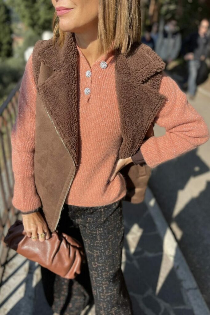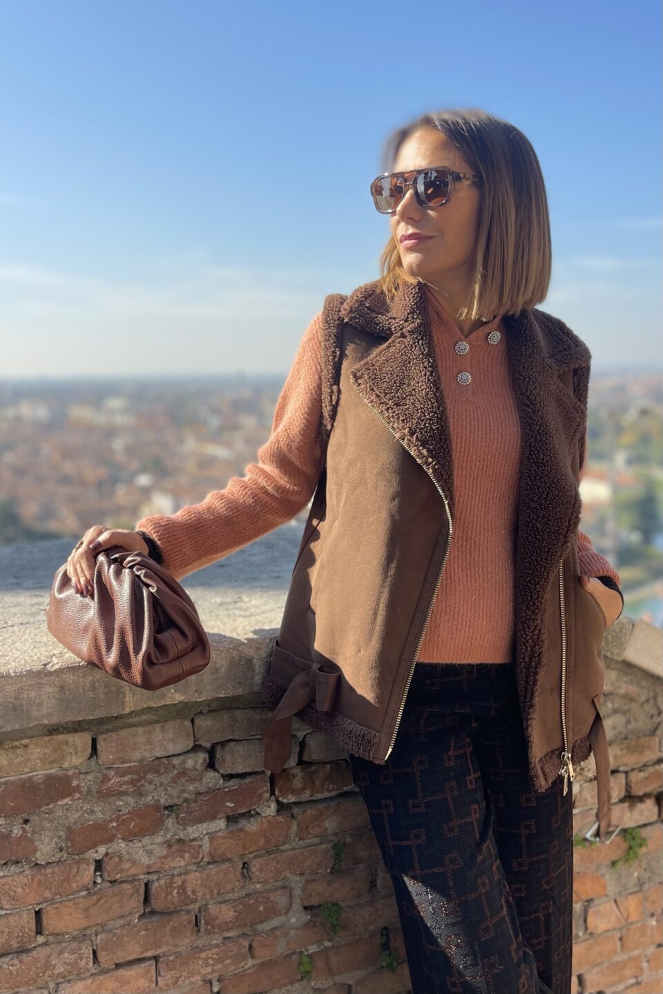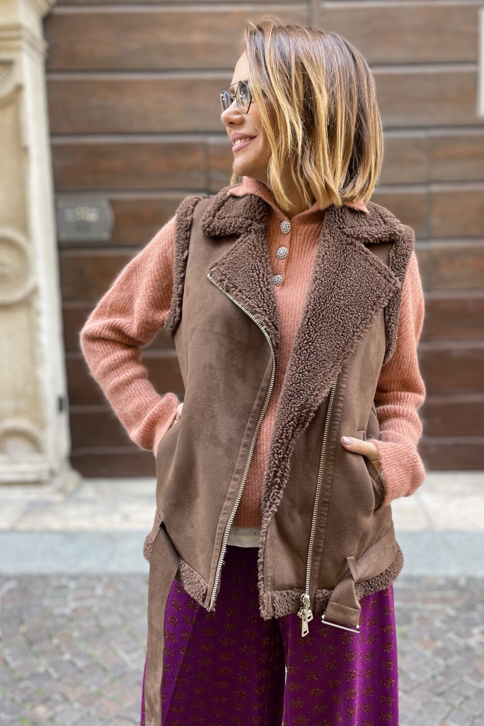 Aggiungi subito al tuo guardaroba questo smanicato marrone scamosciato e porta un tocco di eleganza e praticità in ogni tuo outfit!