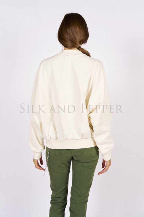 Realizzata in una raffinata tonalità burro e in una morbida felpa italiana (85% cotone, 15% poliestere), è perfetta per completare look casual o per aggiungere un tocco di stile a outfit più eleganti.