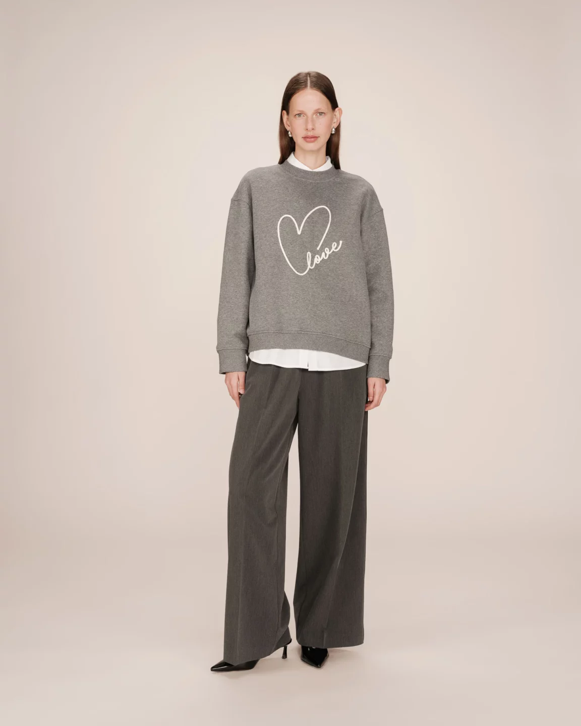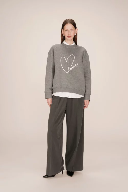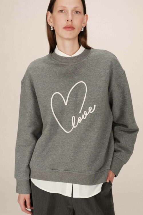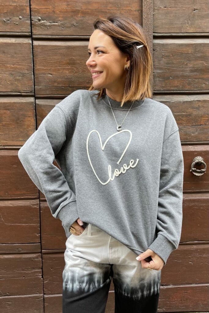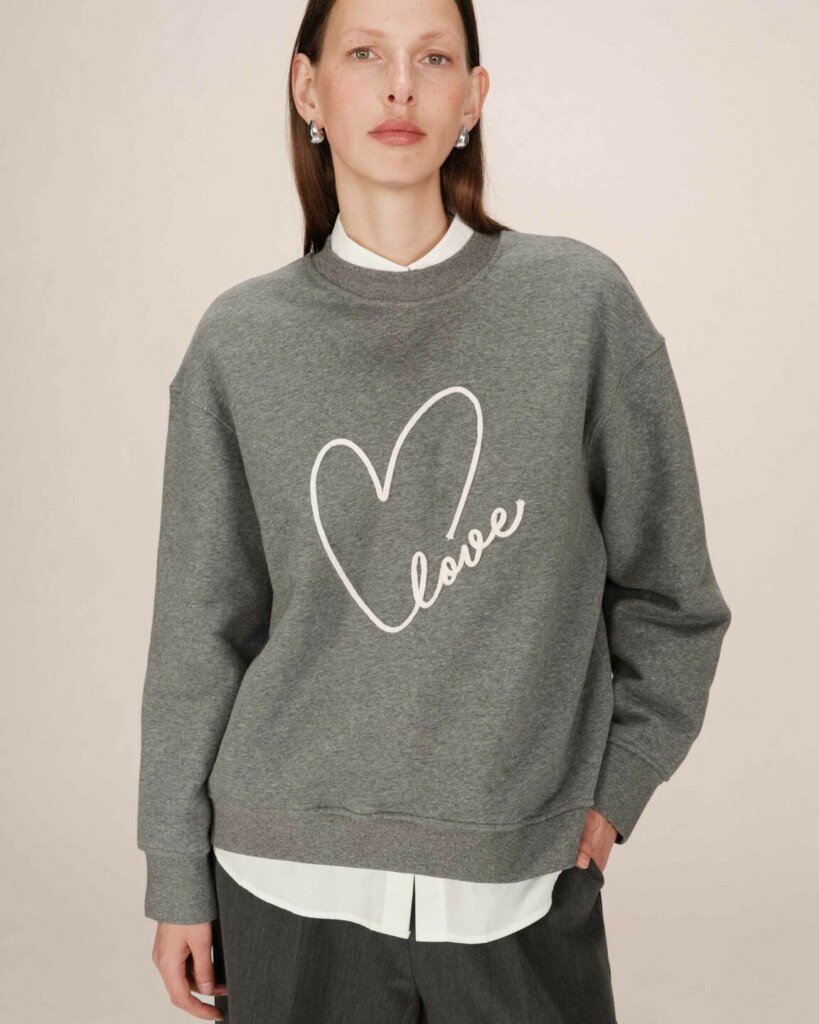 La felpa oversize è un capo must-have della collezione fw25. Realizzata in 80% cotone e 20% poliestere, si distingue per l’elegante ricamo “Love” sul davanti, simbolo di femminilità e forza.
