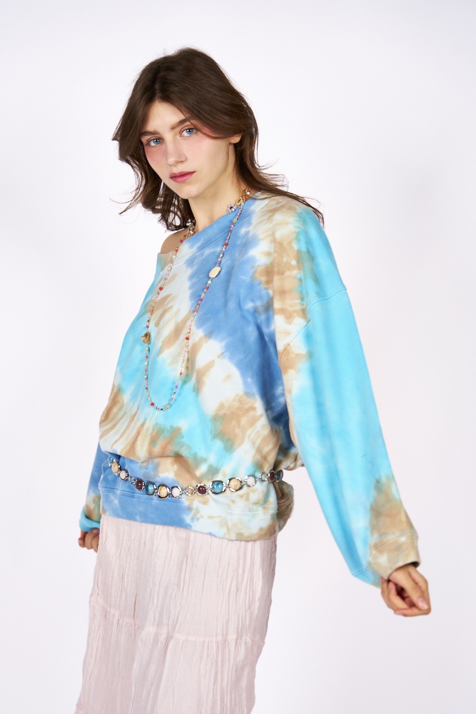 Realizzata in morbido cotone con stampa tie dye blu dal fascino vintage, questa felpa combina comfort assoluto e stile contemporaneo. Il taglio oversize avvolge la silhouette con naturalezza, regalando un look rilassato ma incredibilmente cool.