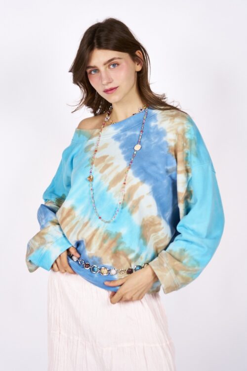 Le sfumature tie dye nei toni del blu creano un effetto dinamico e originale, perfetto per aggiungere carattere anche agli outfit più semplici. Il dettaglio più seducente? Puoi indossarla anche con le spalle scoperte, per un tocco femminile, disinvolto e irresistibilmente moderno.