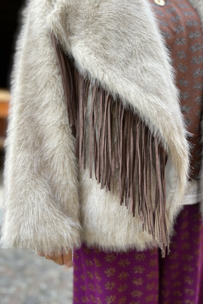 Finta pelliccia beige con frange in alcantara marroni rimovibili tramite zip (chiusura con ganci)