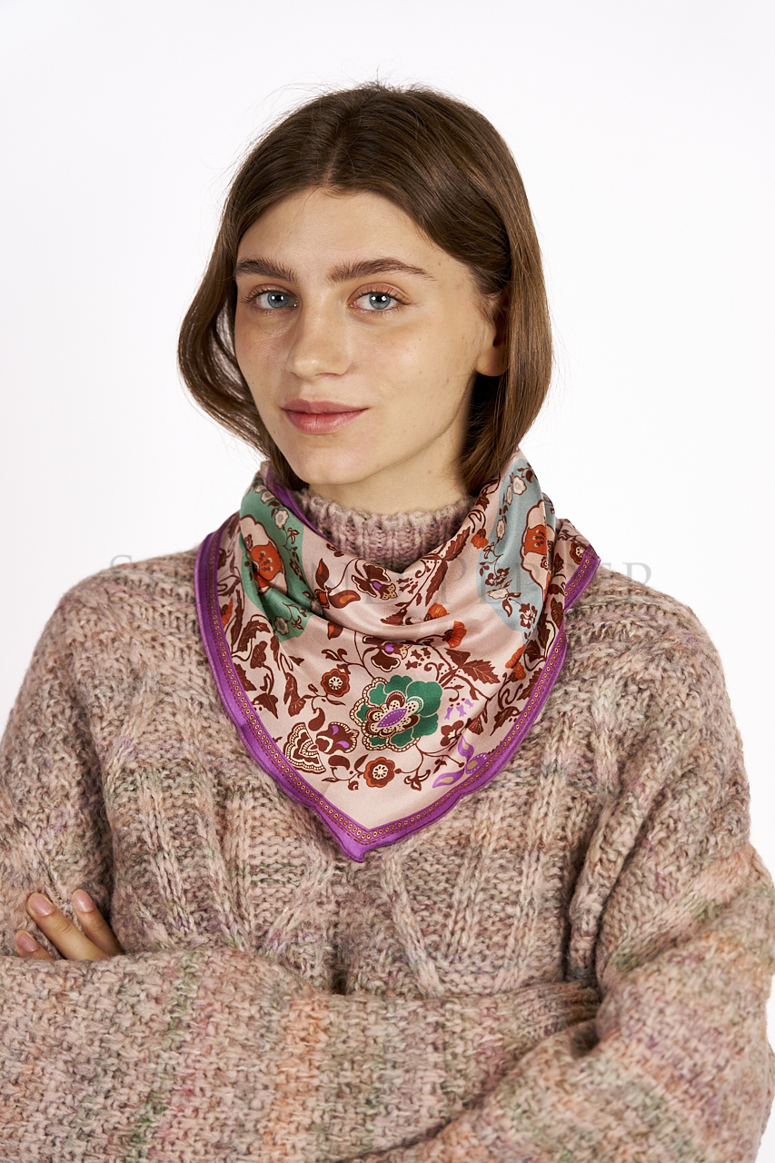 Aggiungi un tocco di eleganza senza tempo al tuo look con questo raffinato foulard in pura seta donna. Realizzato in Italia con cura artigianale, presenta una delicata fantasia di fiori che si abbina perfettamente alla bordatura violet, creando un accessorio versatile e sofisticato.