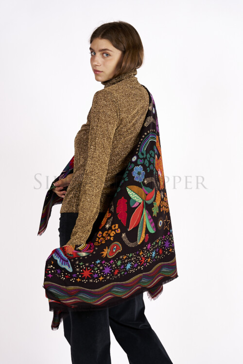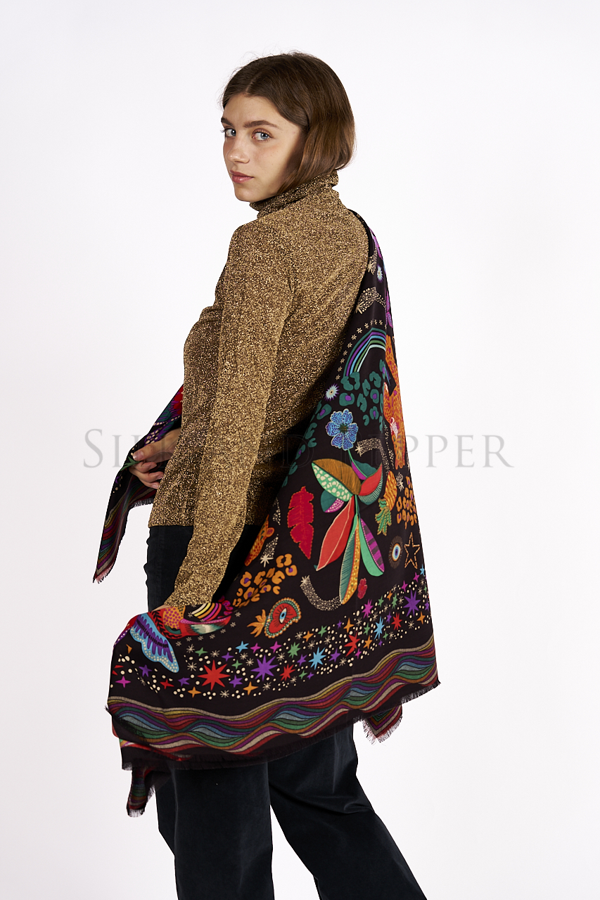 Aggiungi carattere e stile ai tuoi outfit con questo foulard donna grande (135×135 cm) in 100% viscosa morbida e leggera. Il design esclusivo unisce stampe di tigre, fiori colorati, stelle luminose e un cuore con ali, tutti su un elegante fondo nero, per un look grintoso e sofisticato allo stesso tempo.