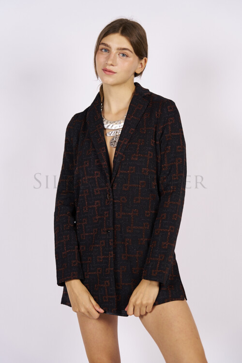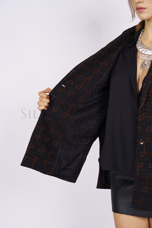 Il collo a revers classico, le maniche lunghe e i due spacchi laterali garantiscono comfort e libertà di movimento, mentre la fodera interna in lurex tinta unita tono su tono aggiunge una nota luminosa e discreta, tipica del design Made in Italy.