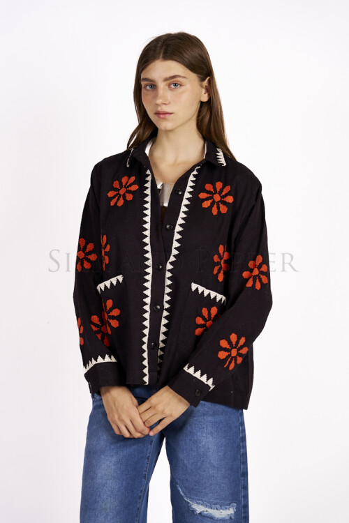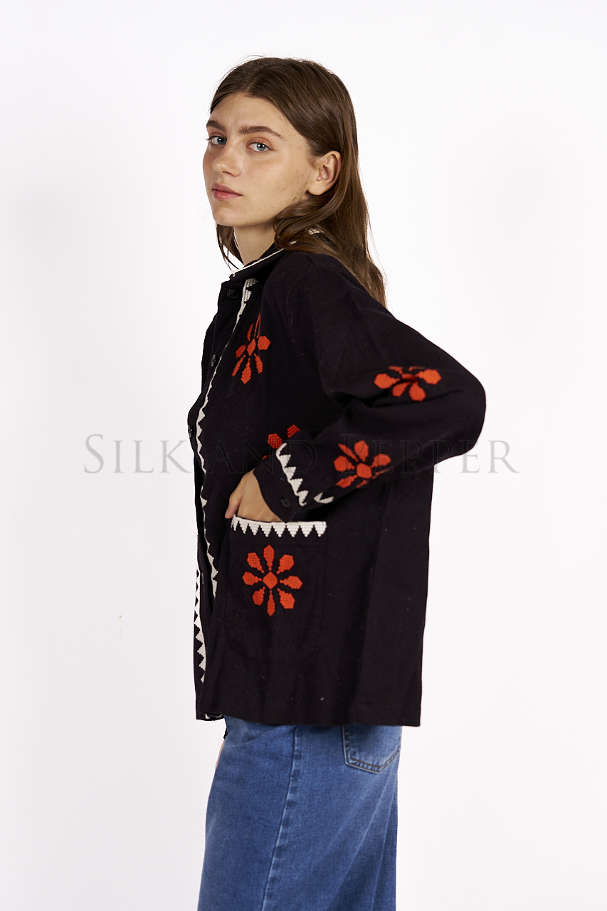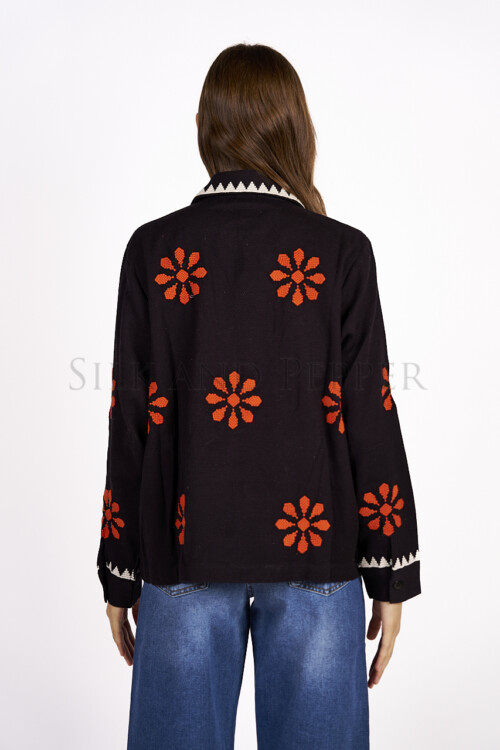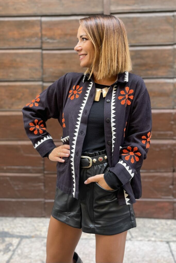 Giacchino donna in cotone nero con fiori arancio ricamati