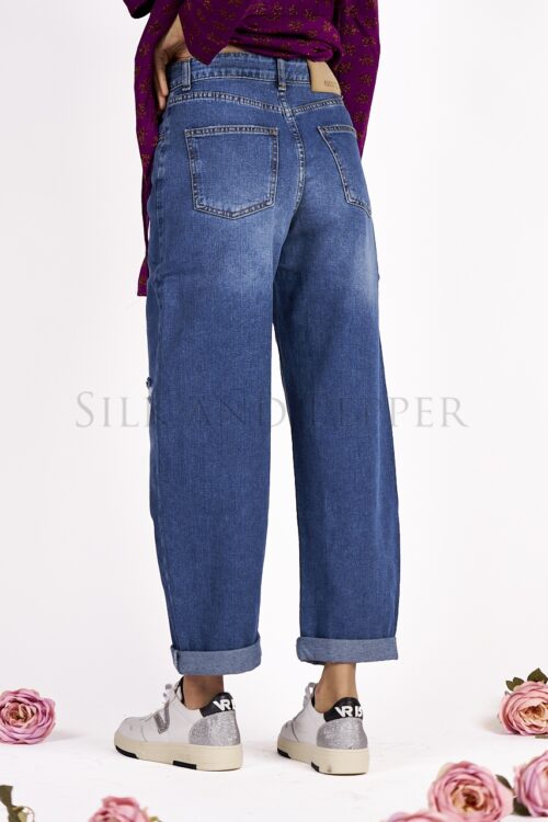 Jeans baggy carrot in denim blu con dettaglio rovinato su una coscia, perfetti per uno stile casual ma ricercato. Realizzati in 100% cotone di alta qualità e made in Italy, questi jeans uniscono comfort e tendenza con un taglio moderno a cavallo basso e gamba che si stringe verso il fondo.