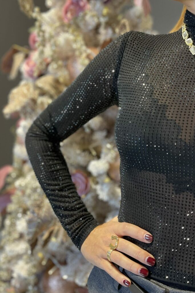 Valorizza il tuo look con un capo versatile e ricercato: il lupetto tulle strass nero diventerà un must-have del tuo guardaroba.