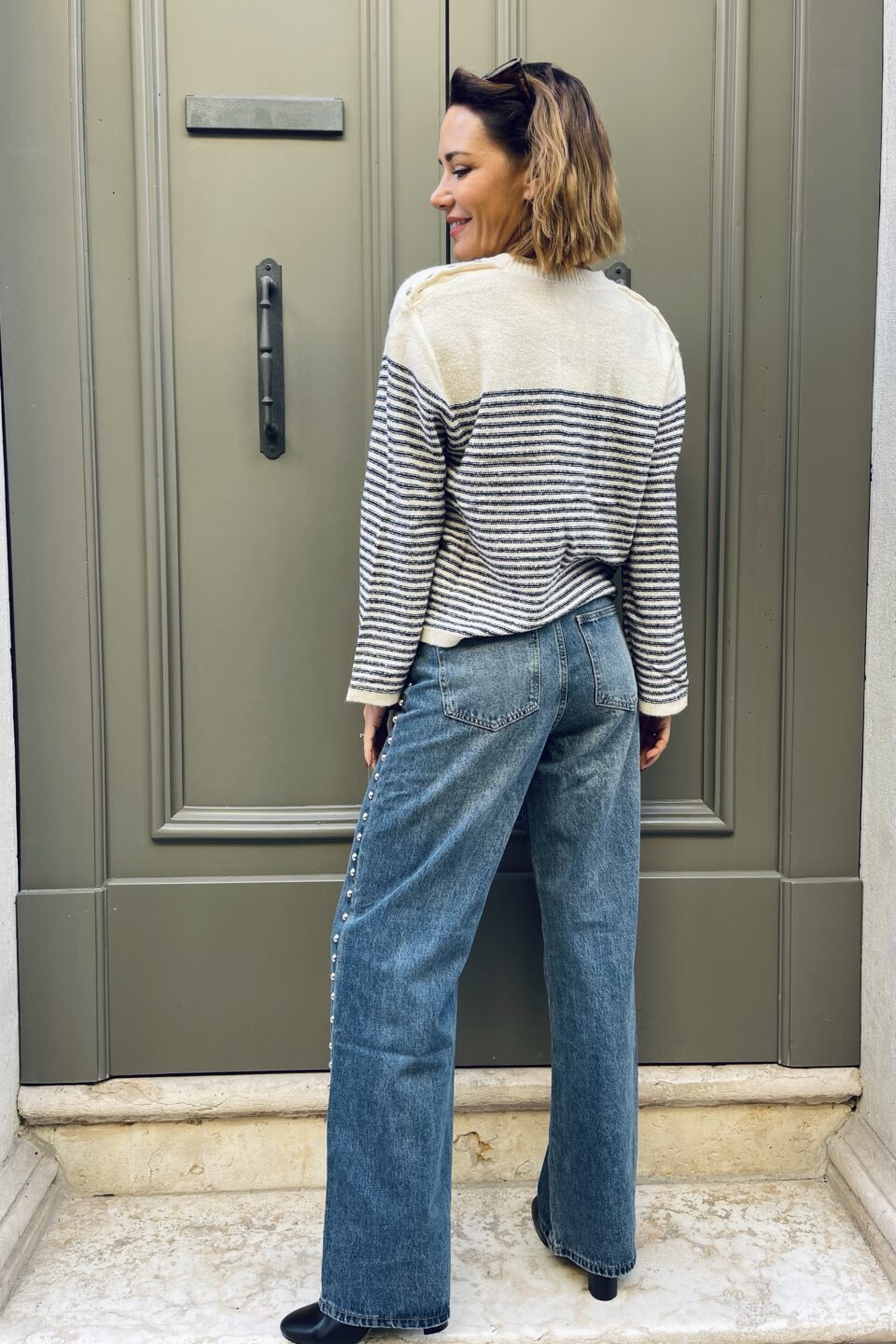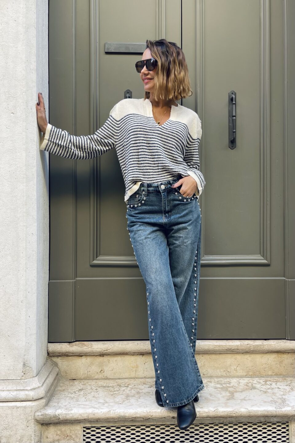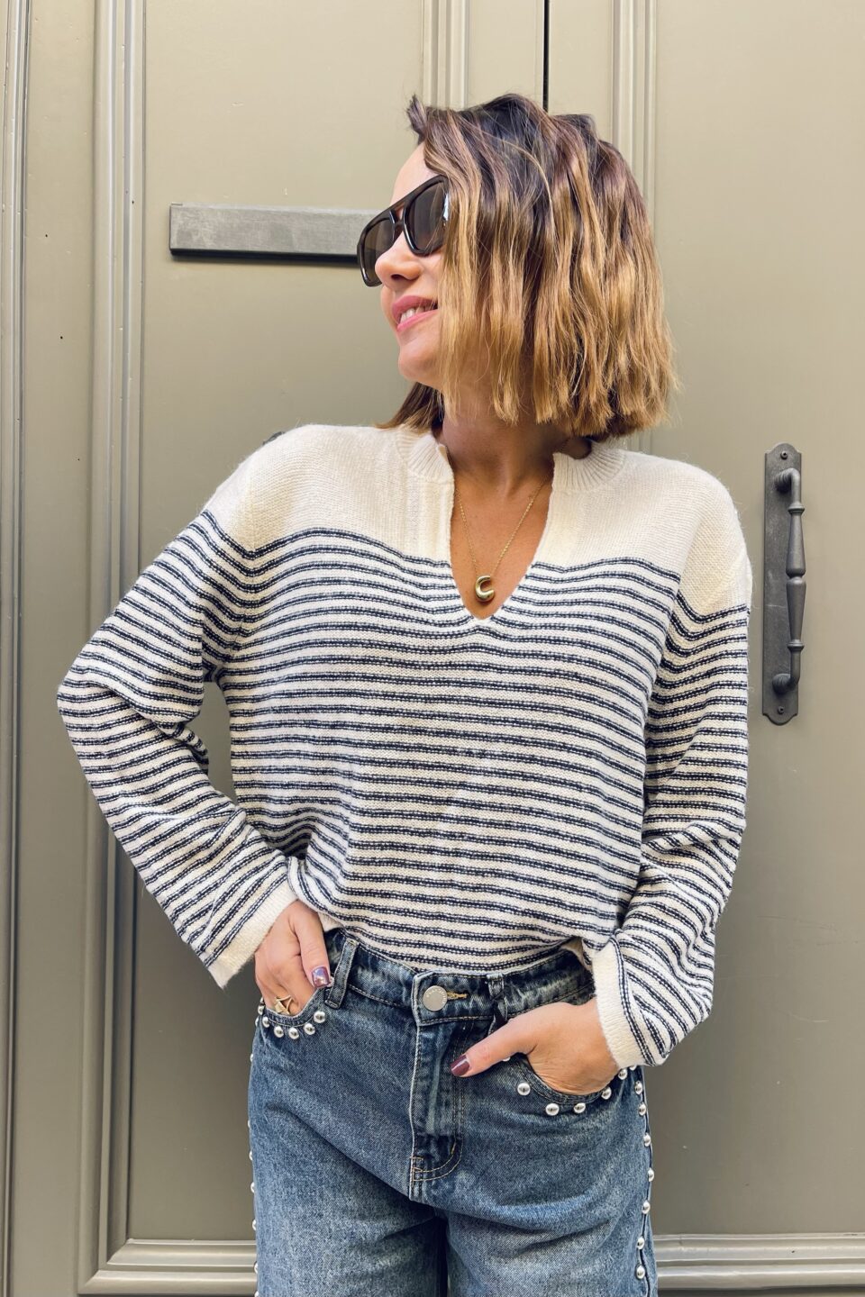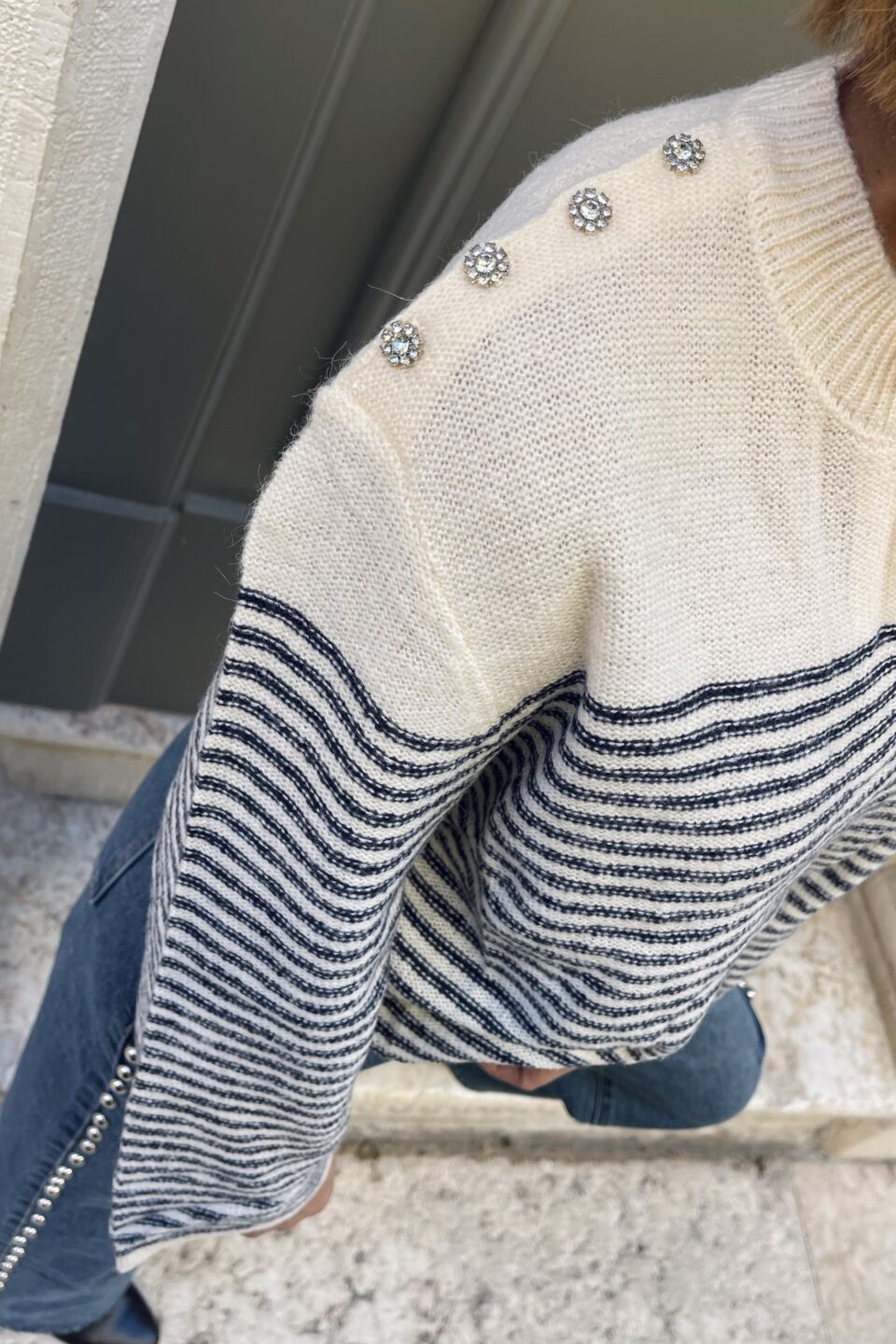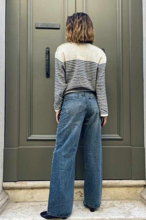 Scopri la nostra elegante maglia  con righe blu navy, un capo versatile con scollo a V, maniche scampanate e bottoni gioiello sulla spalla. Morbida e calda, perfetta per look raffinati e quotidiani.