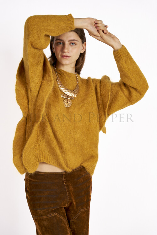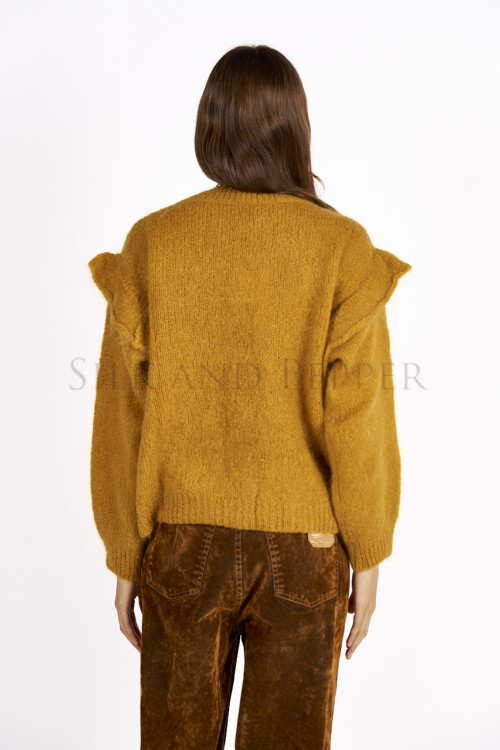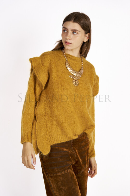La maglia ambra con voulant è la scelta perfetta per chi ama lo stile sofisticato con un tocco di luce.