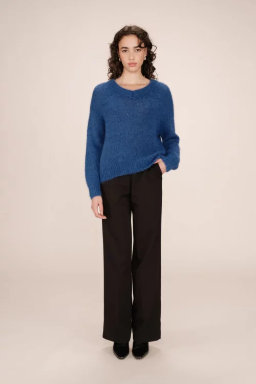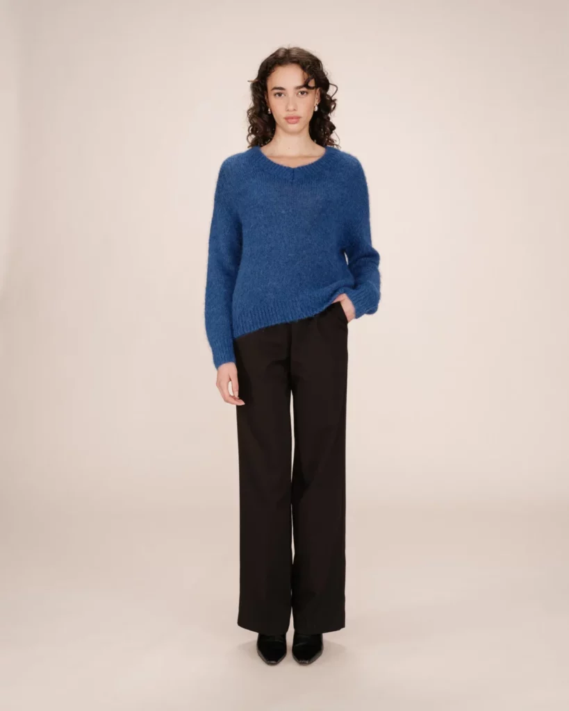 Il modello si distingue per lo scollo a V con finitura tubolare, che dona un dettaglio moderno e femminile, mentre le linee minimaliste rendono questo maglione un capo versatile da abbinare a jeans, pantaloni eleganti o gonne.