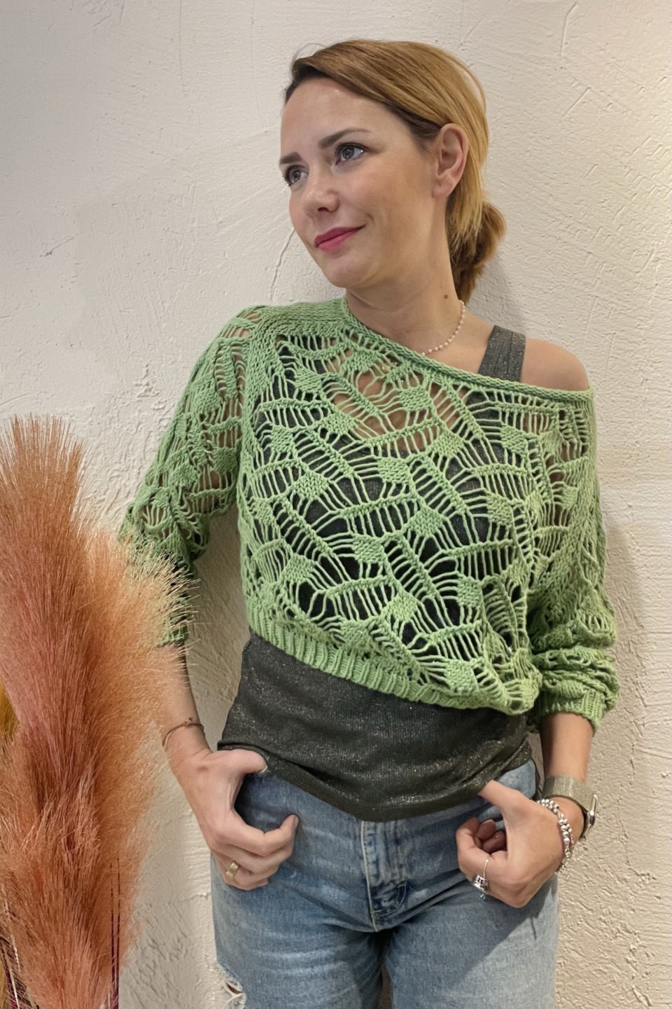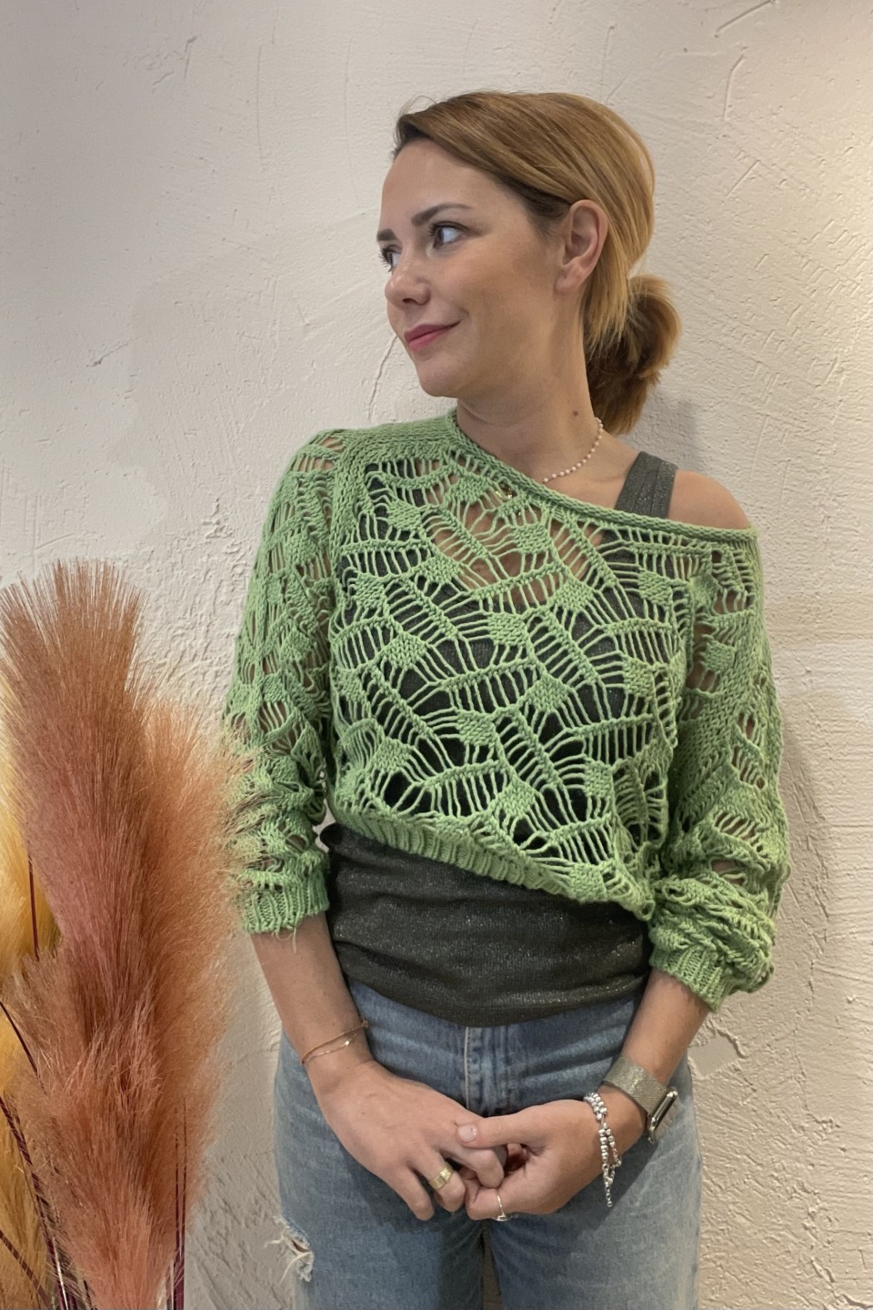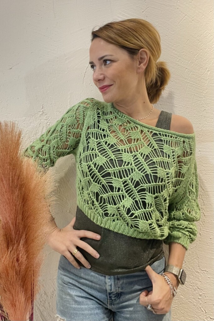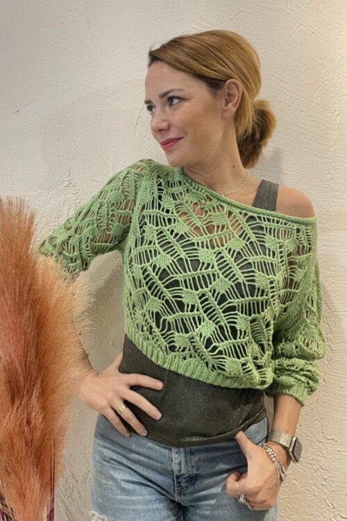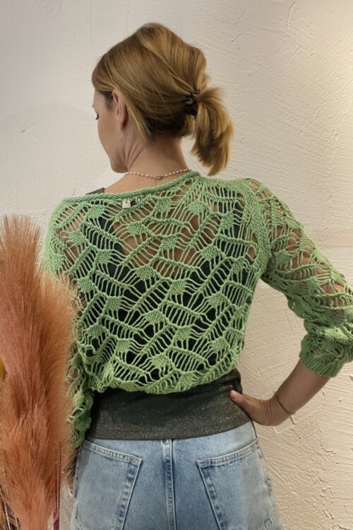 Maglia crop traforata verde manica 3/4