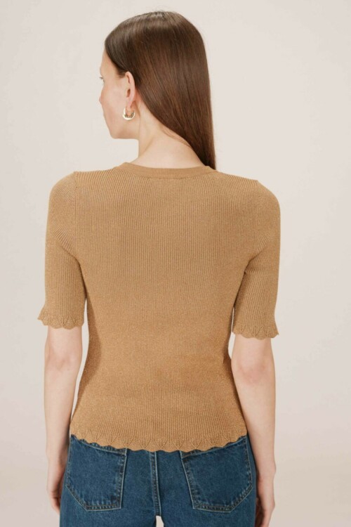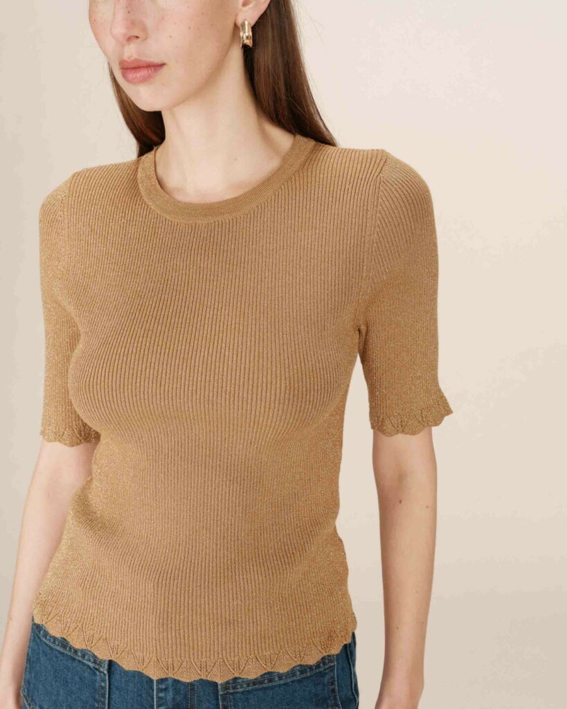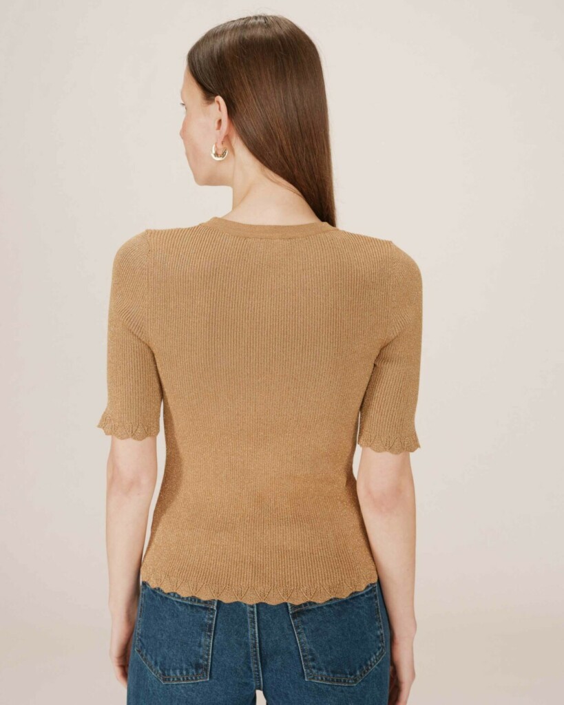 Il suo design slim fit in maglia a coste sottili valorizza la silhouette femminile creando un elegante effetto seconda pelle. La cura dei dettagli, come il girocollo tubolare e le finiture decorative sui bordi delle maniche e sul fondo, rende questa maglia a maniche corte un capo raffinato e facile da abbinare.